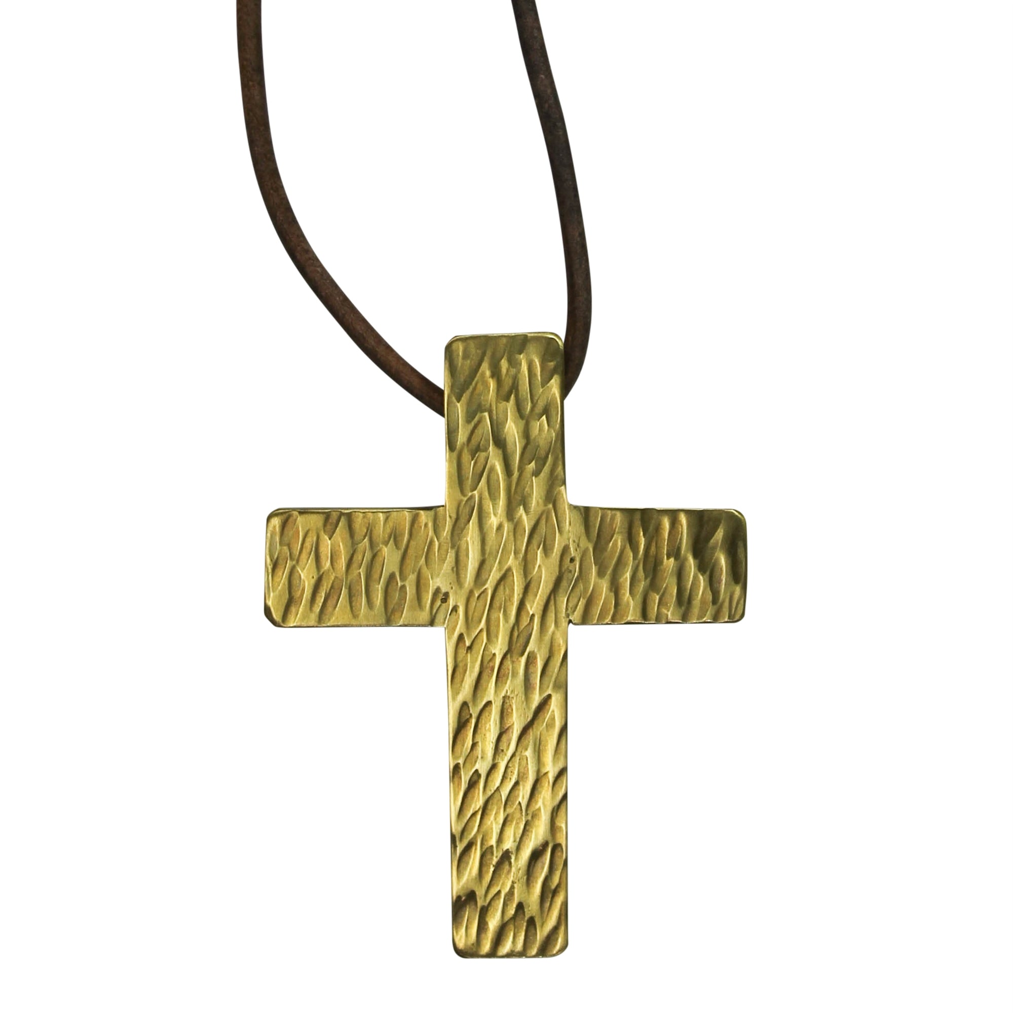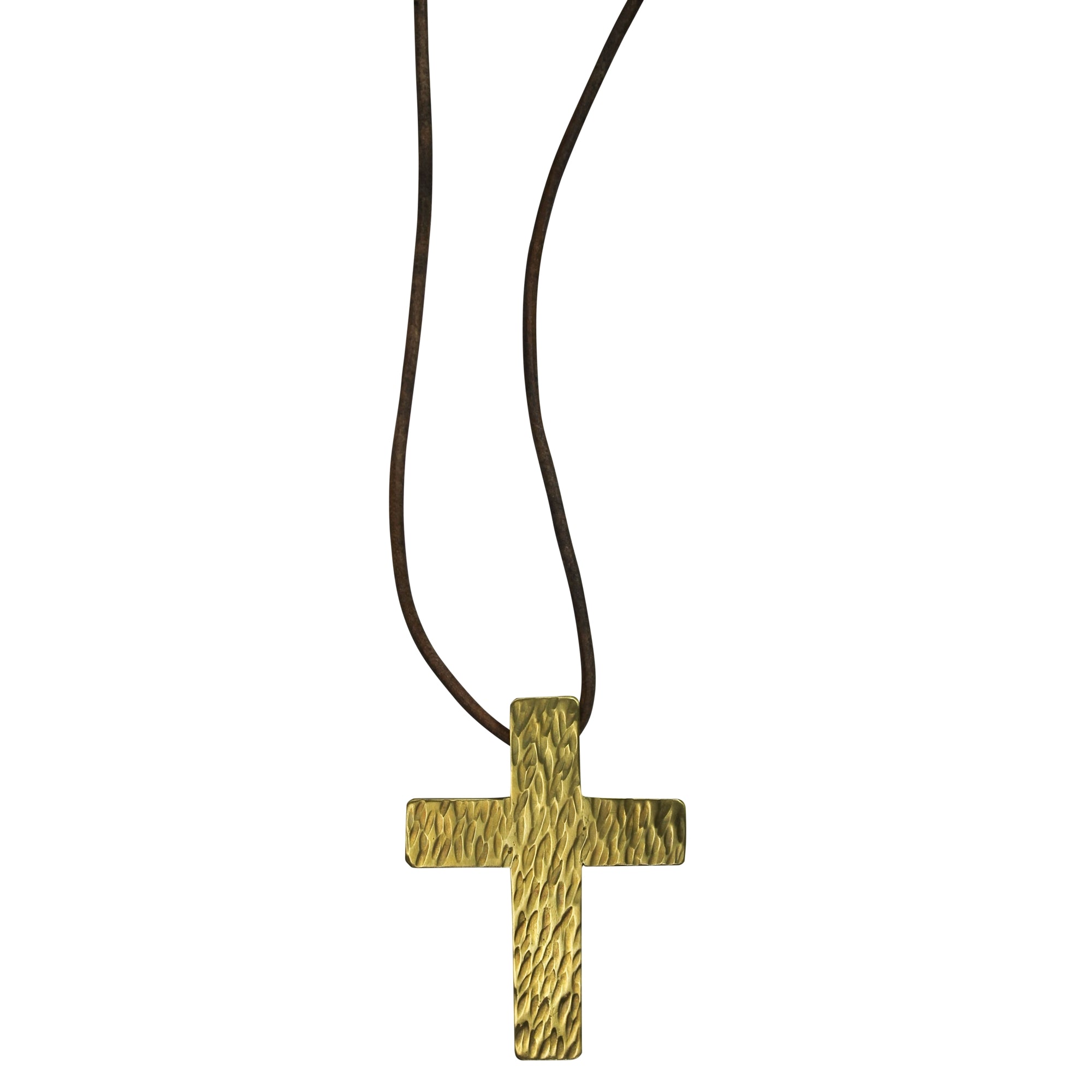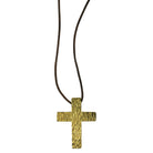 Hand hammered texture is applied to thick pieces of brass to offer a talisman-like quality to these heavy weight crosses. Strung on a 24” adjustable leather cord for a natural style. pendant on 24” adjustable leather cord