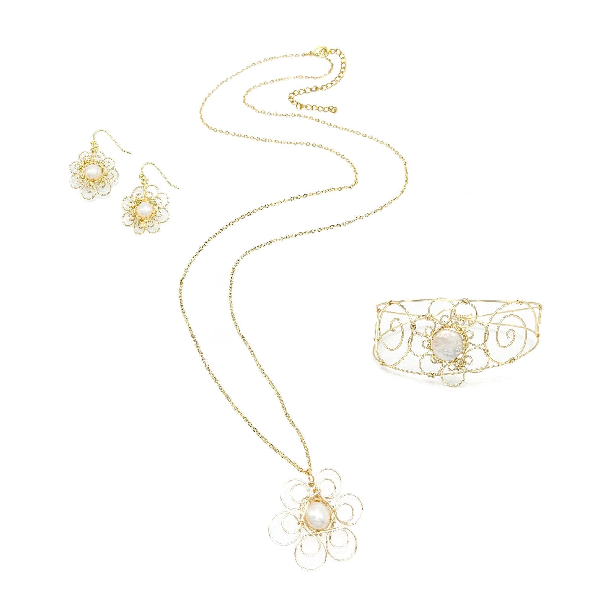 Starting from a spool of gold plated wire, our artisans meticulously swirl and twist until this stunning earring emerges! An 8mm freshwater pearl is surrounded by 8 double looped petals of gold plated wire and then suspended on a hypoallergenic gold plated fishhook. 1 inch in diameter and 1 1/2 inches total length.