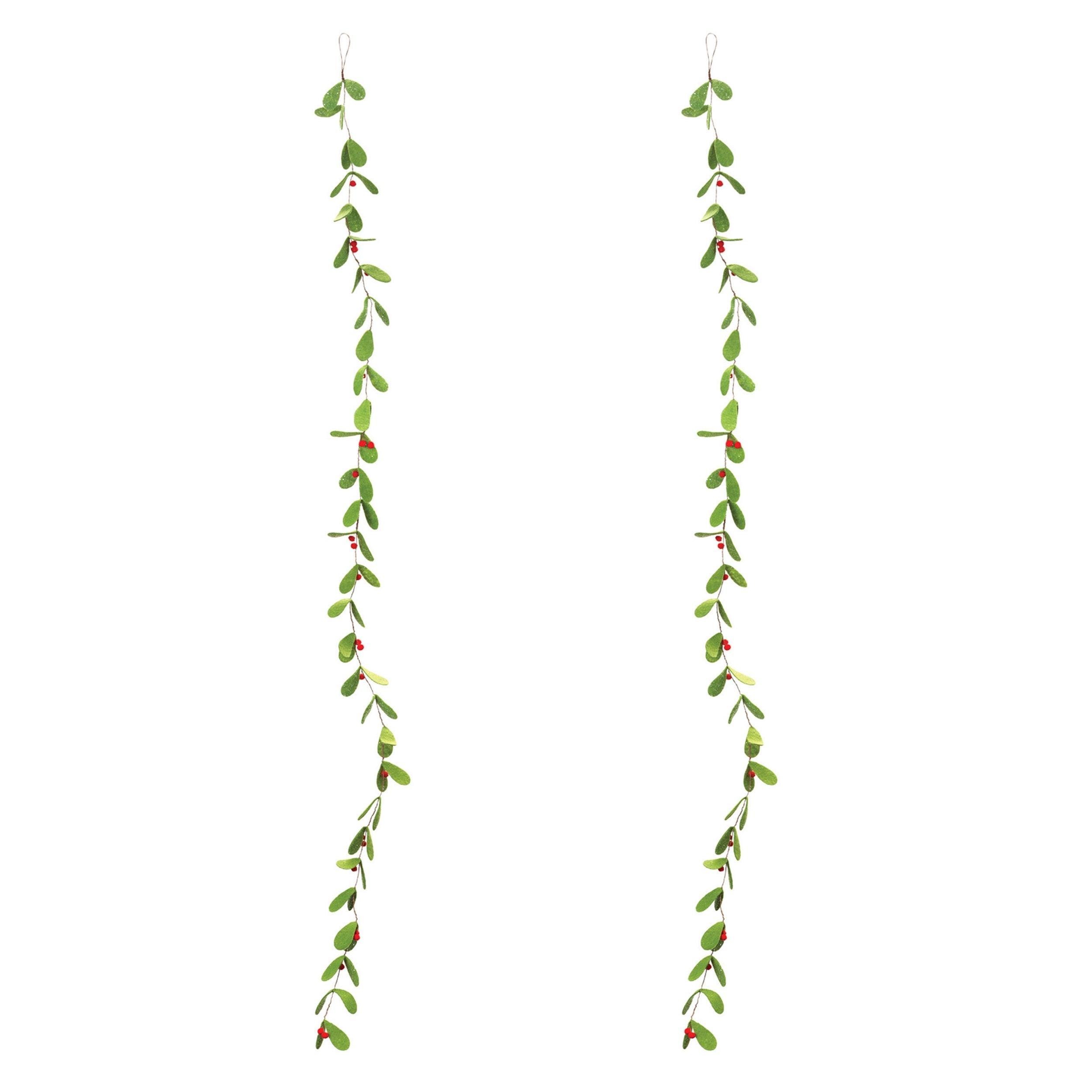 Get ready to decorate your home this holiday season with a set of Fabric Mistletoe String Garlands! Featuring festive green tones and traditional mistletoe leaf design, this set is sure to fit right in with your holiday decor. The quality polyester fabric compsosition is sure to endure for seasons to come. Adorn your Christmas tree or staircase banister with this lovely accent, or weave the pieces into a pine wreath or pine garland for added holiday cheer.
