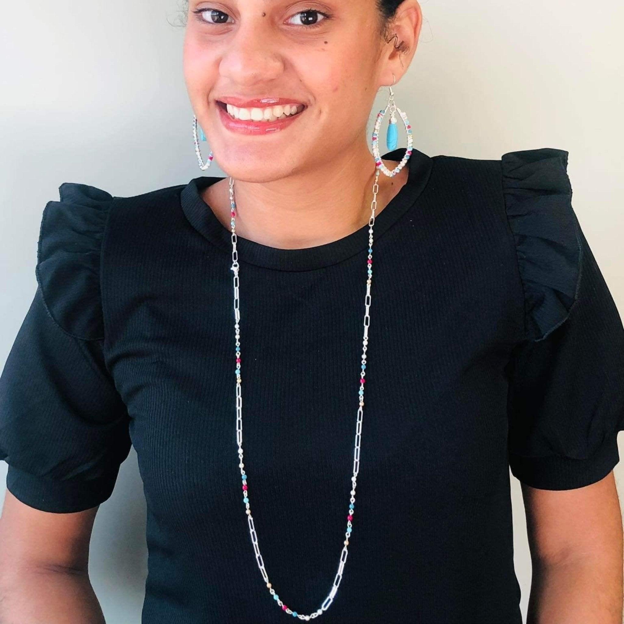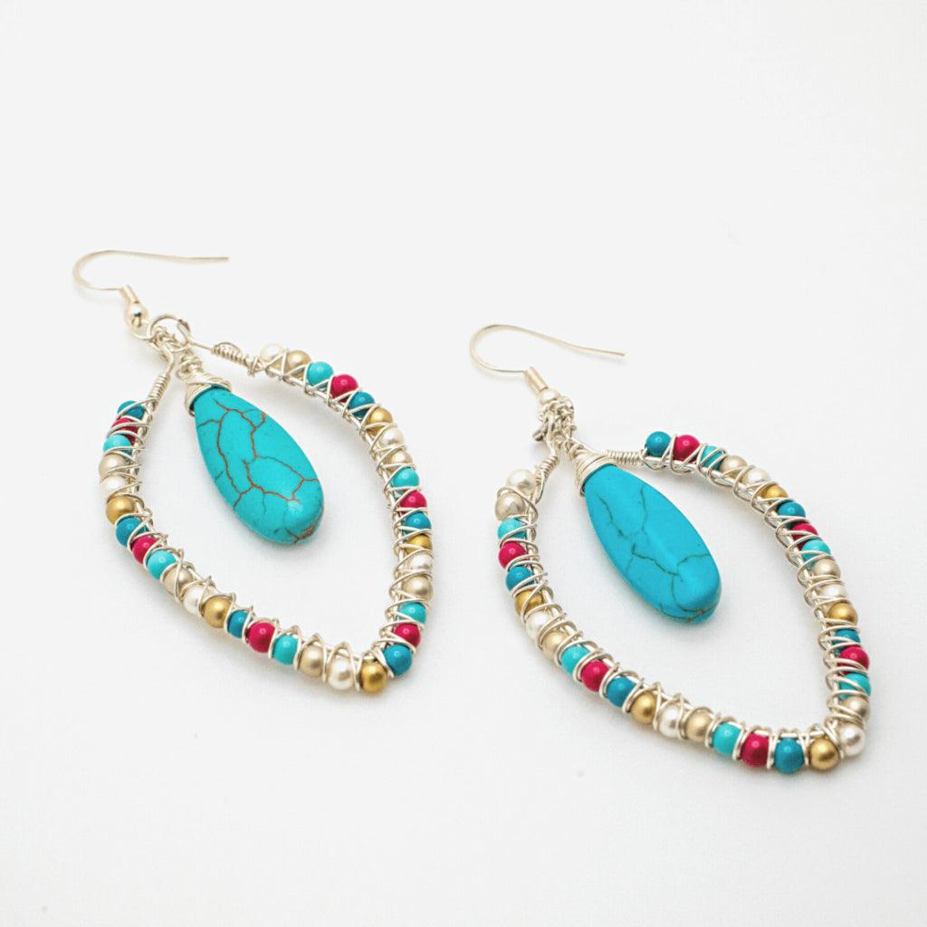 Colorful wired majorca pearl beads are wrapped around this leaf shaped silver wire earrings. A long teardrop shaped turquoise bead is the centerpiece of this bold and colorful statement earring. Silver plated stainless steel fishhooks make this a 2 7/8 inch earring.
