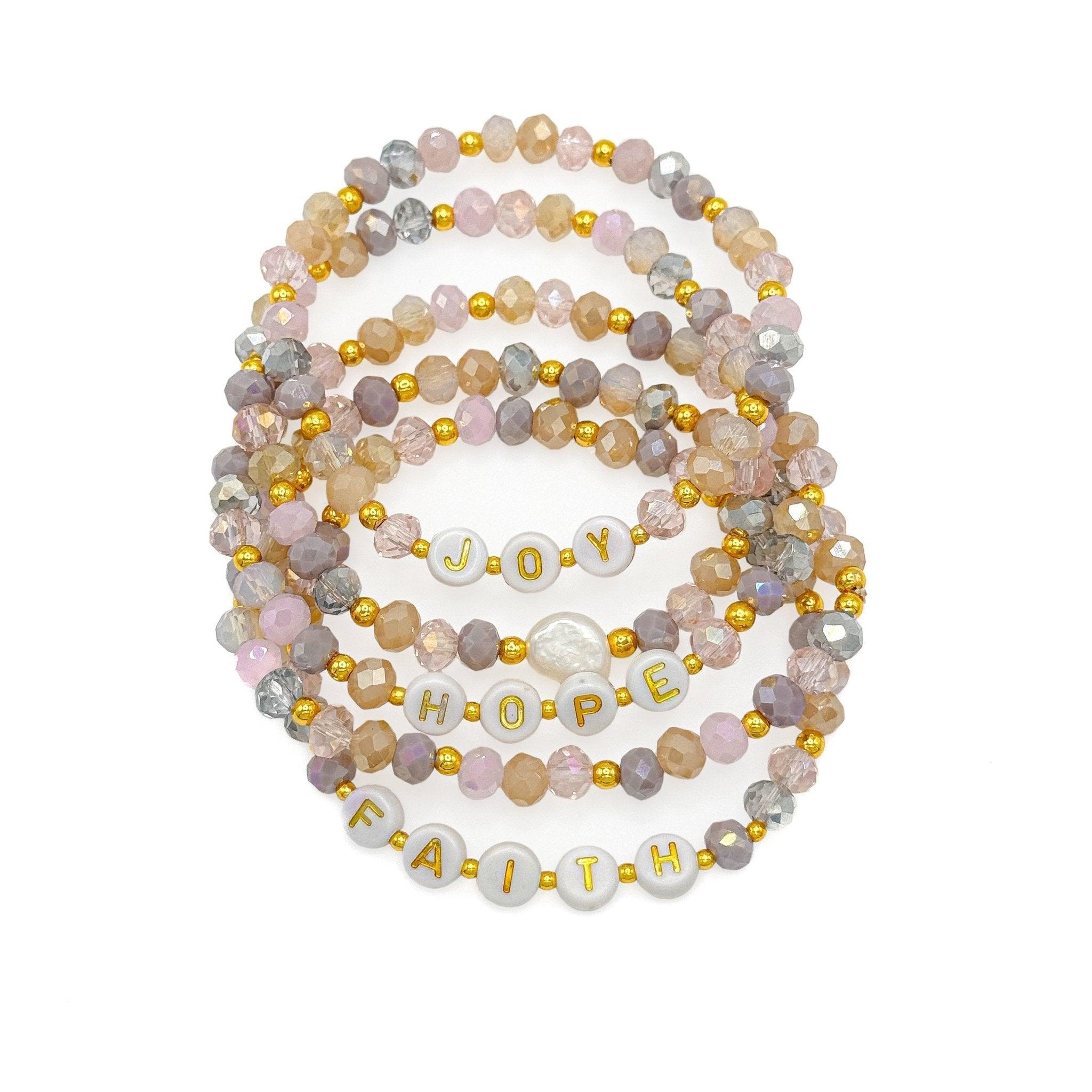 The three word bracelets feature white acrylic beads with gold lettering and a pattern of gold spacer beads and crystals in hues of pale pink, silver, lavender and champaign.