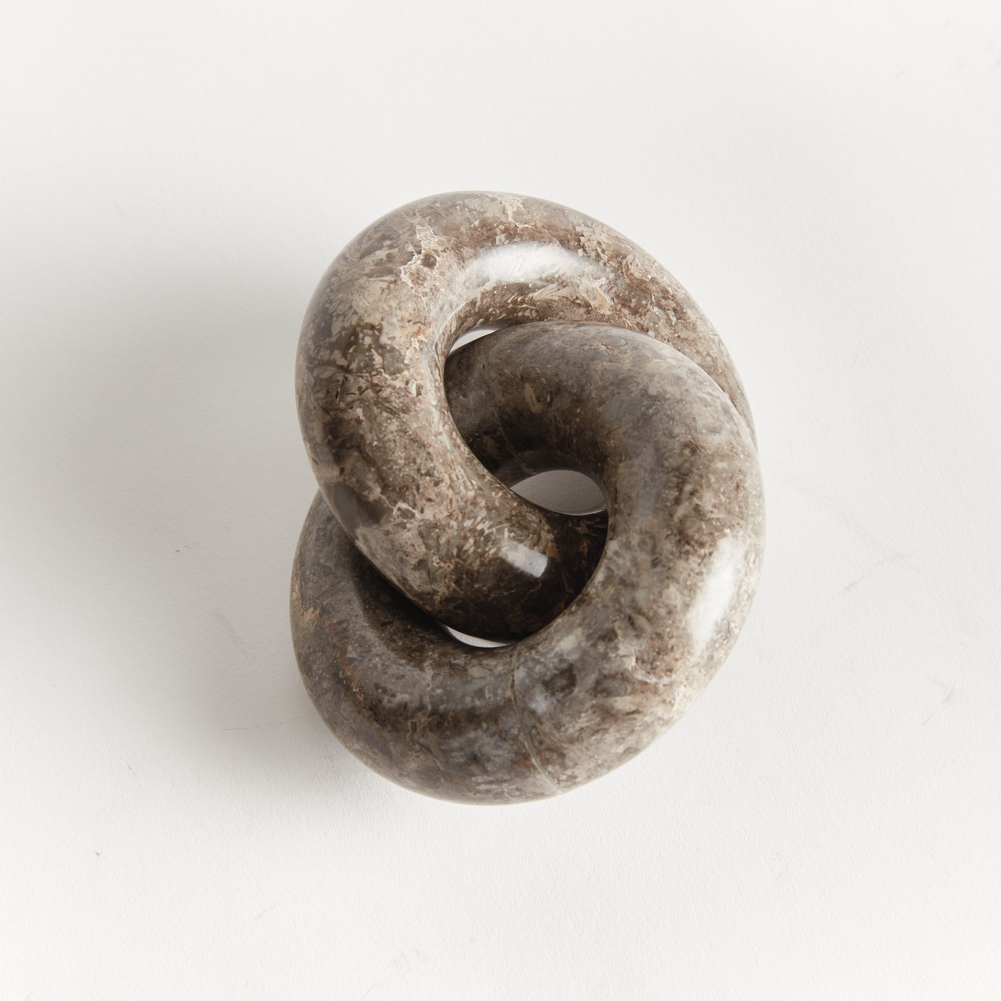 Honed to a semi-matte finish, this stunning marble is particularly known for its unique dark brown to light brown broad lines. The clay minerals found in this type of marble are what gives our linked rings sculpture its stunning unique brown veining. A beautiful accent atop home office desk, bookshelf or entry console.