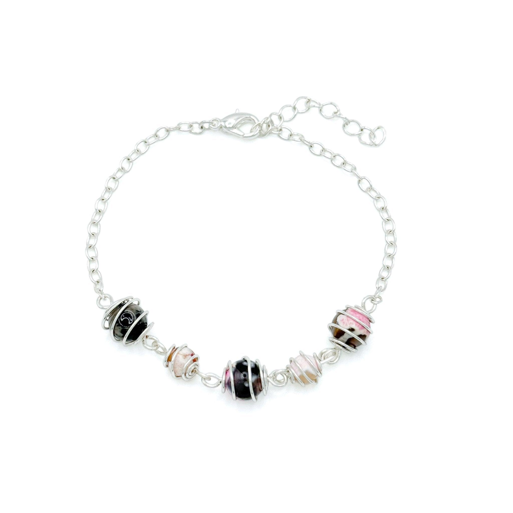 Rich 8mm and 6mm agate beads swirling with pink, white, brown and black are spiral wire wrapped together in links and finished with a bold round cable chain and lobster clasp. Adjustable from 6 3/4 - 8 1/4 inches.