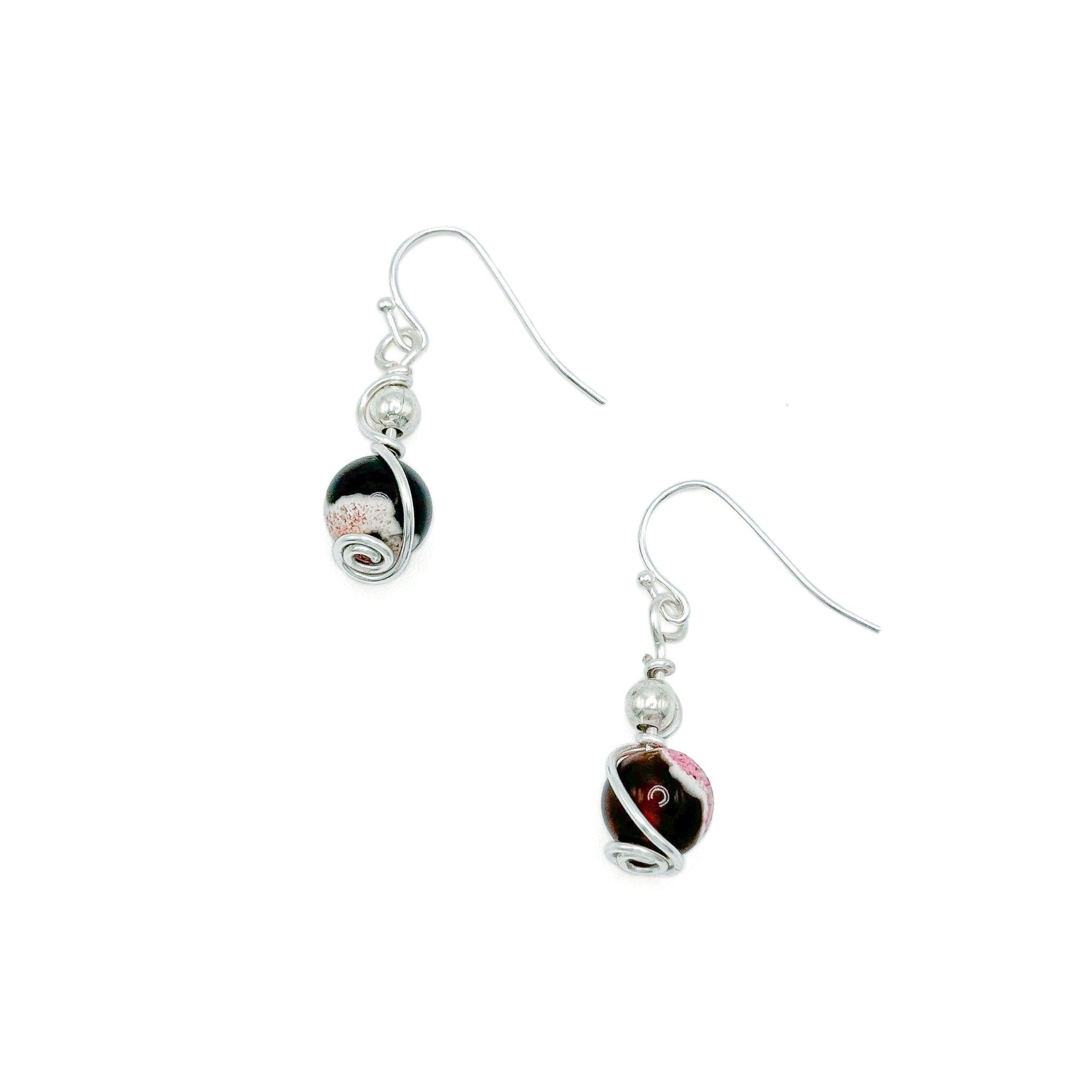 Mesmerizing 8mm agate beads with swirls of pink in neutrals of white, brown and black are elegantly silver wire wrapped onto a silver plated fishhook with a silver bead accent.