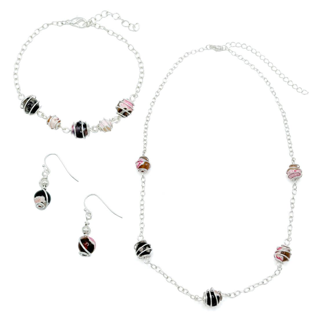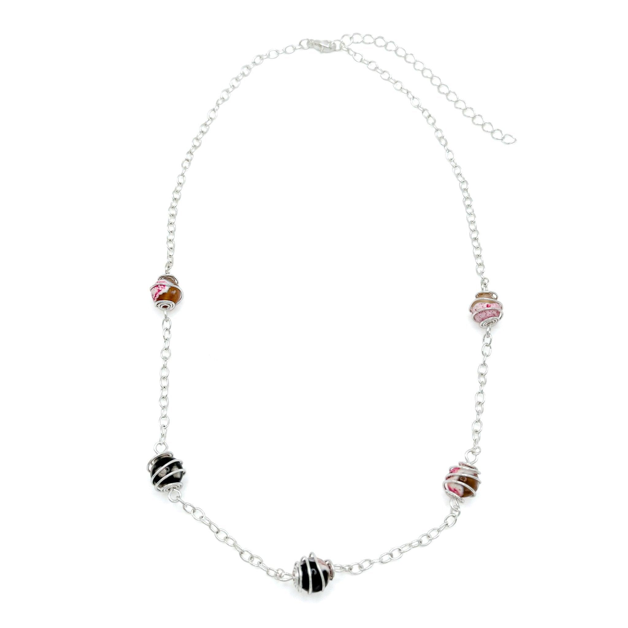 5 Captivating 8mm agate beads of pink, white, black and brown are spaced perfectly around this chain collar necklace of bold silver plate cable chain. Silver spiral wire wrapping adds the artistic, handmade elegance of this 16 - 19 inch necklace.
