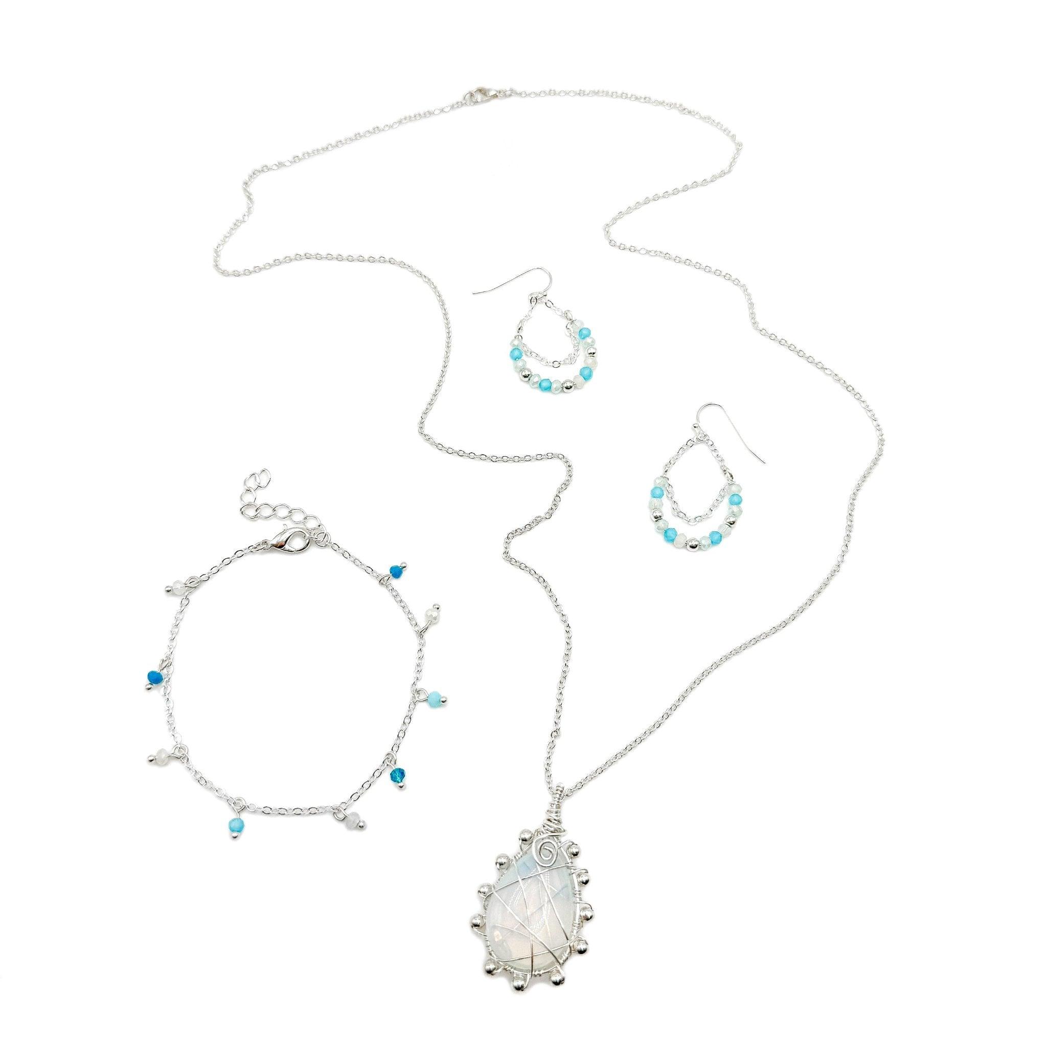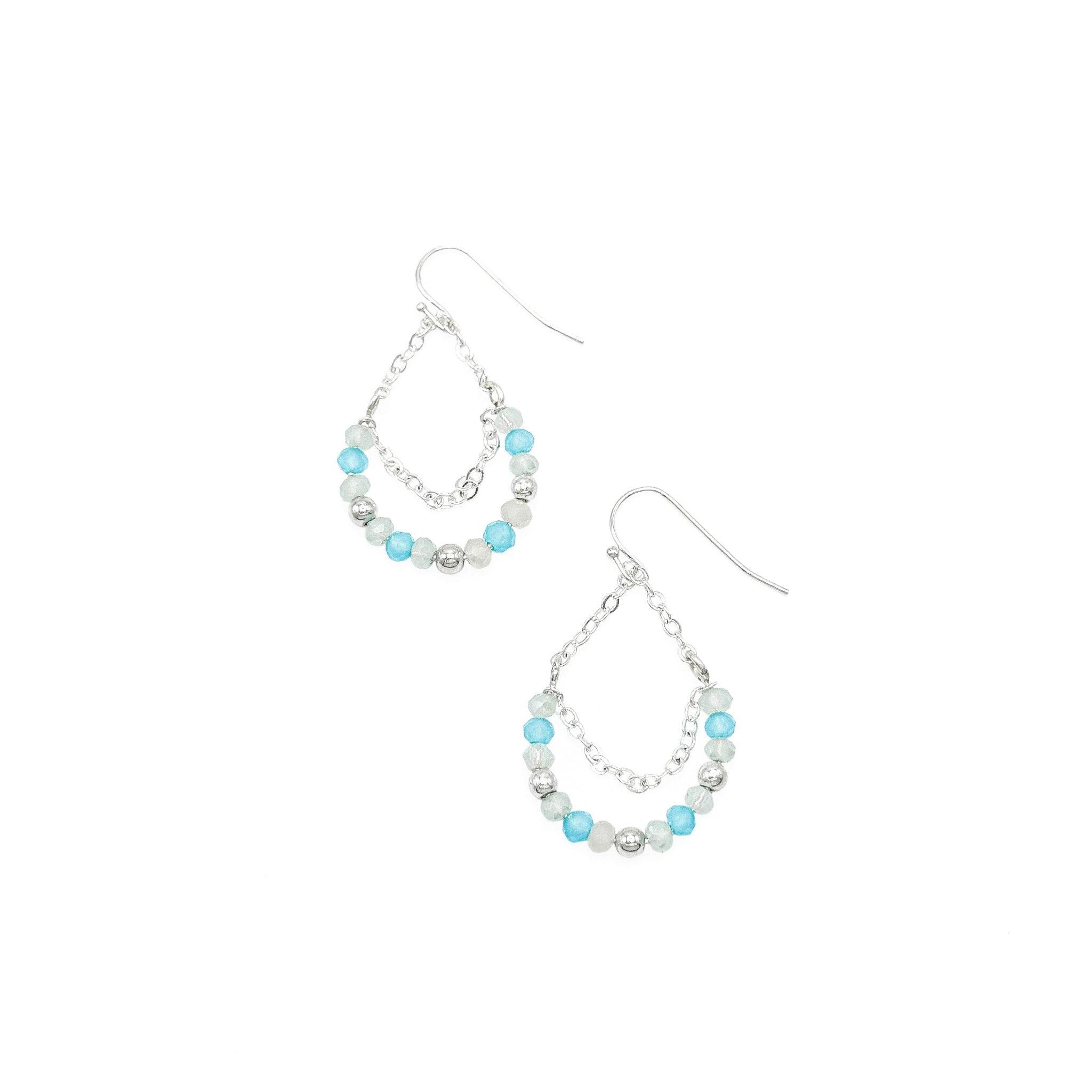 Our artisans have created this new masterpiece from one of our favorite styles! turquoise and white crystals and silver beads are on a silver plated wire and forms the bottom of the teardrop shape finished by the silver plated chain. A second chain adorns the center of the teardrop. A silver plated, hypoallergenic fishhook makes this an easy spring favorite. 1 1/2 inch total length.