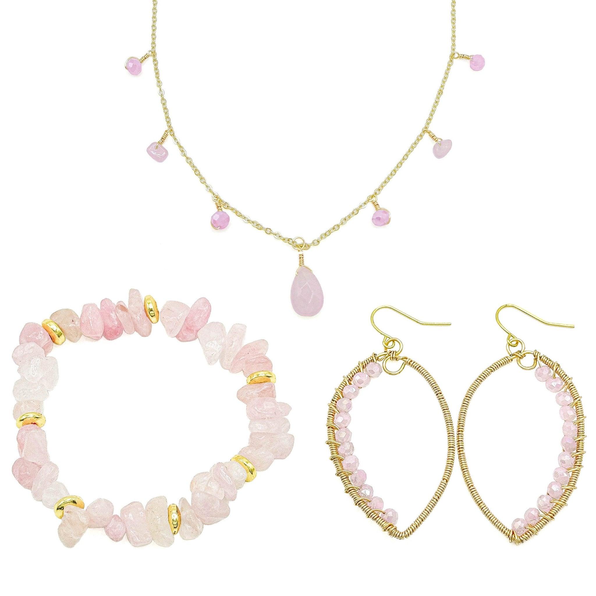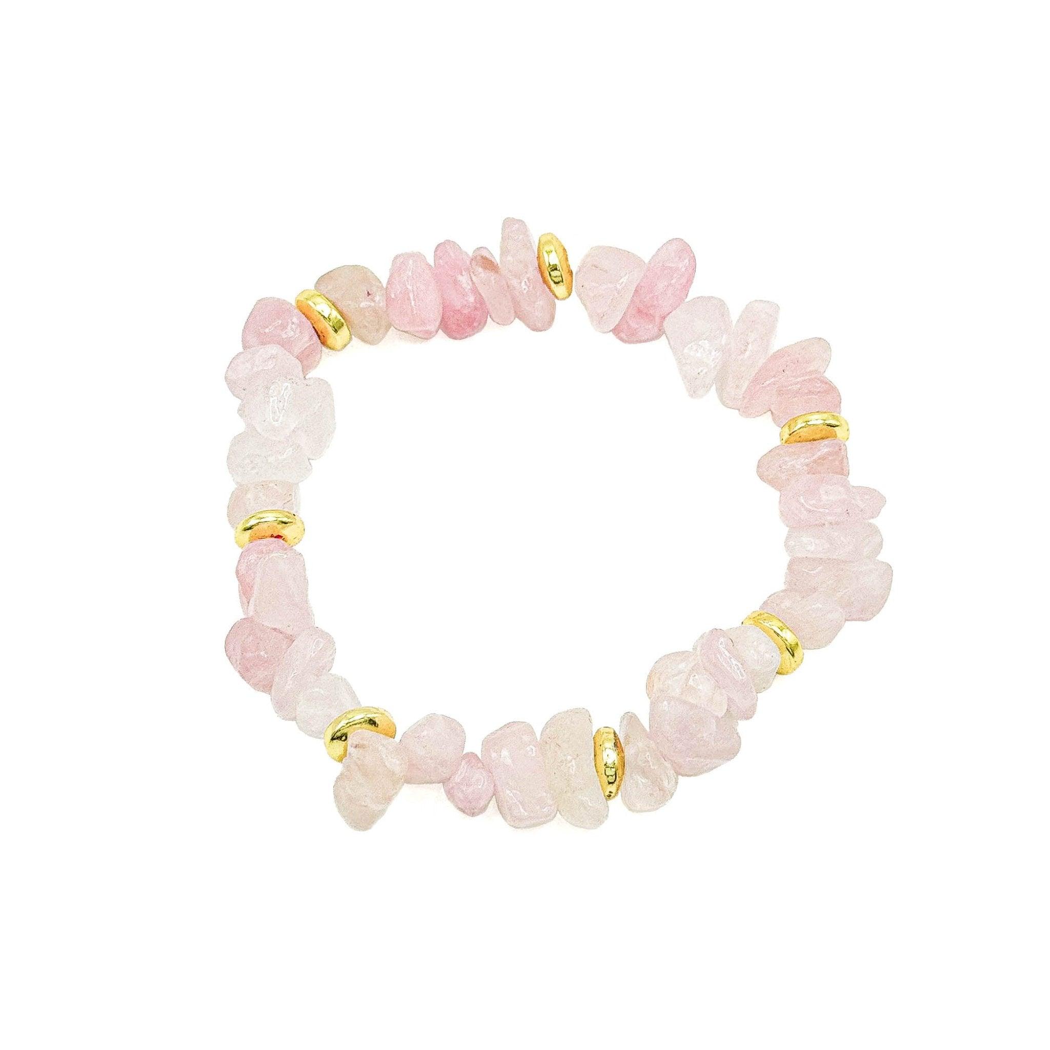 Rose quartz chips and gold filled flat spacers beads create a 6 1/2 - 6 3/4 inch stretch bracelet.