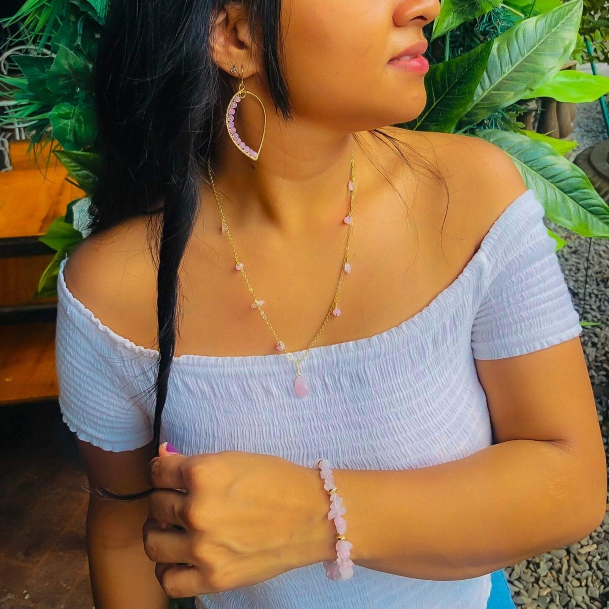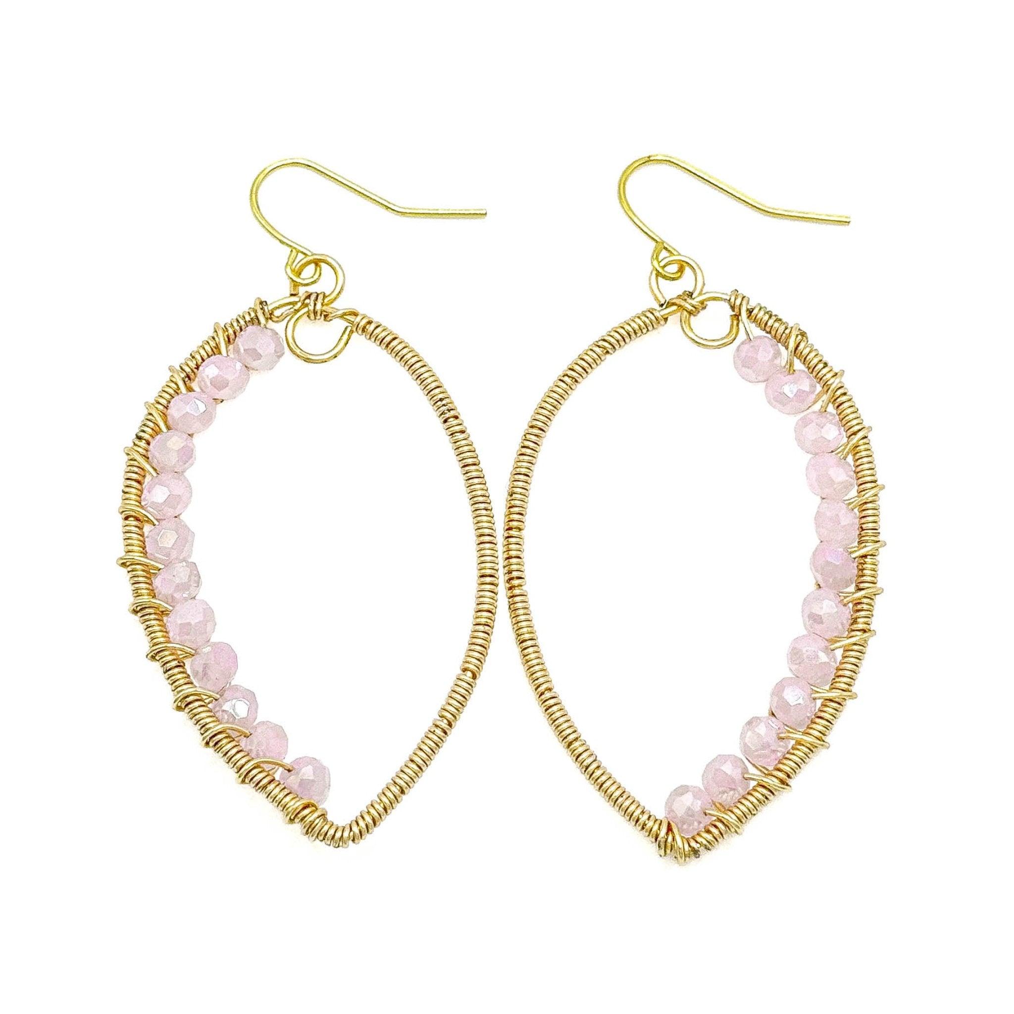 The palest of pink crystals highlights the inside curve of this wire wrapped gold inverted teardrop. A delicate figure 8 connects the statement earring to nickel free surgical stainless steel and 14K gold plated fishhooks.