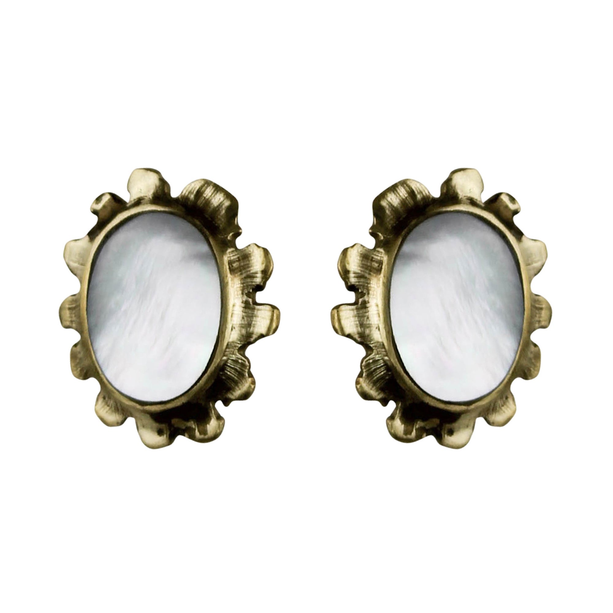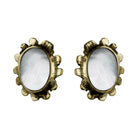 Hand carved Mother of Pearl is set into cast brass medallions. Post-style earring.