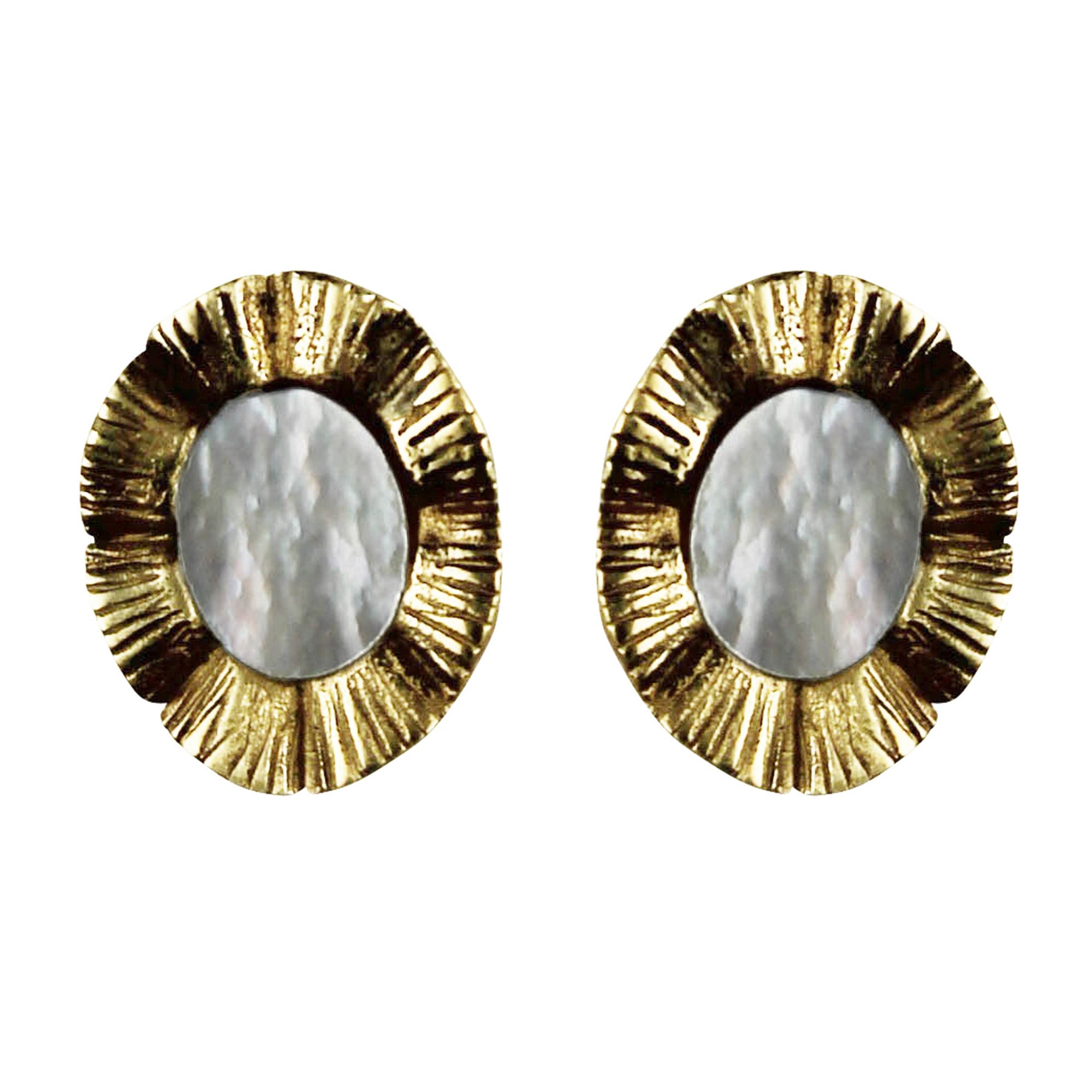 Hand carved Mother of Pearl is set into cast brass medallions. Post-style earring.