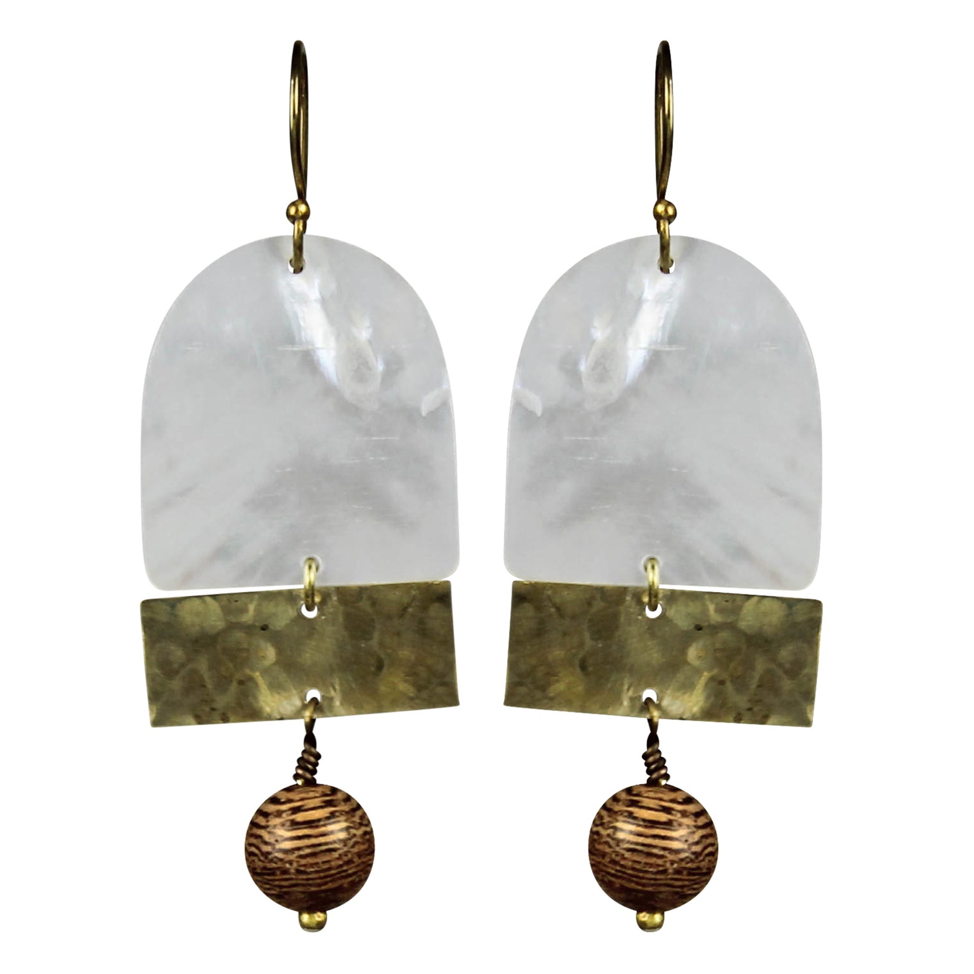 Mother of Pearl and brass and wood are linked to create a light catching earring of mixed materials.