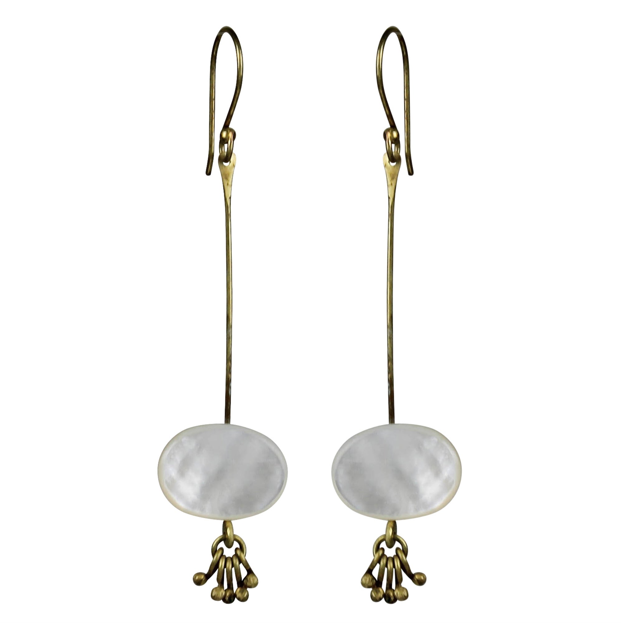Mother of Pearl and brass tassels dangle at the bottom of a simple brass rod creating drama in the simplest form.