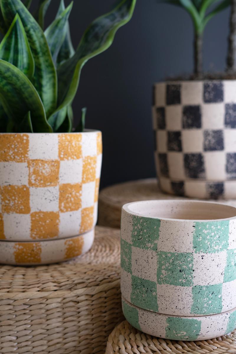 Set Of Three Checkered Clay Planters With Trays