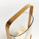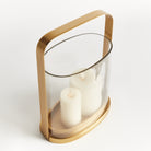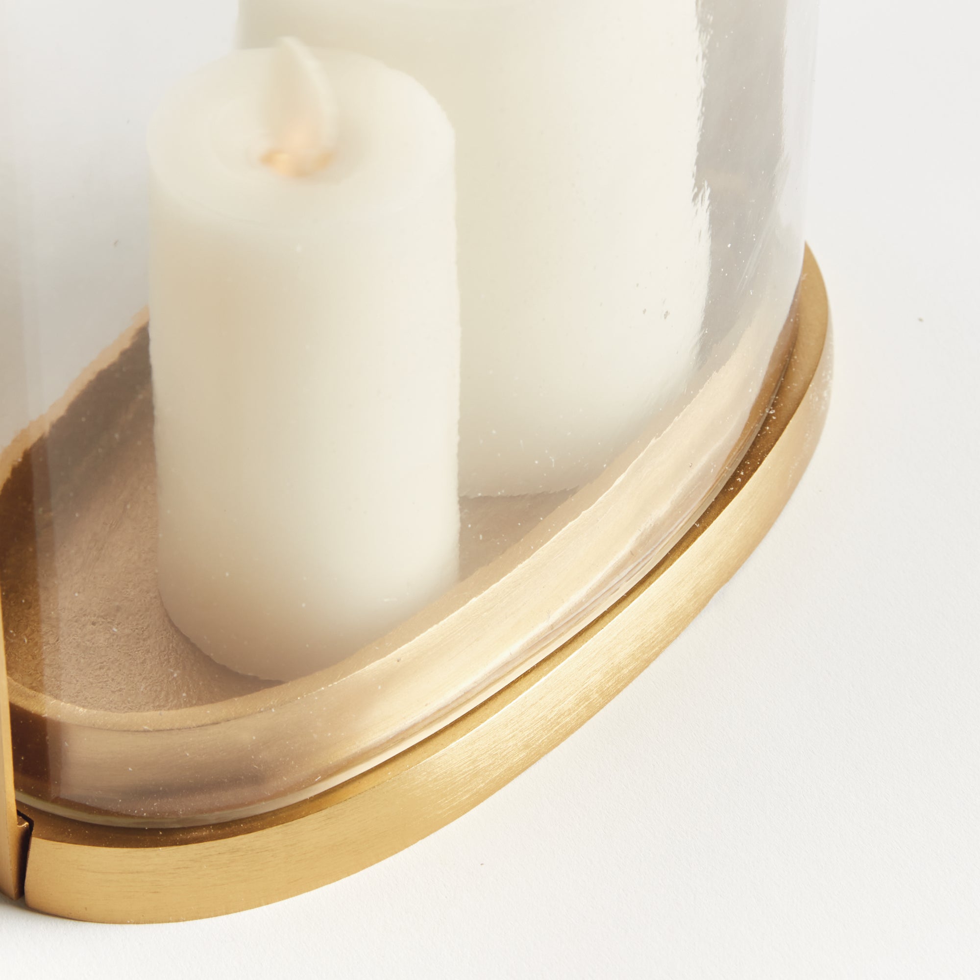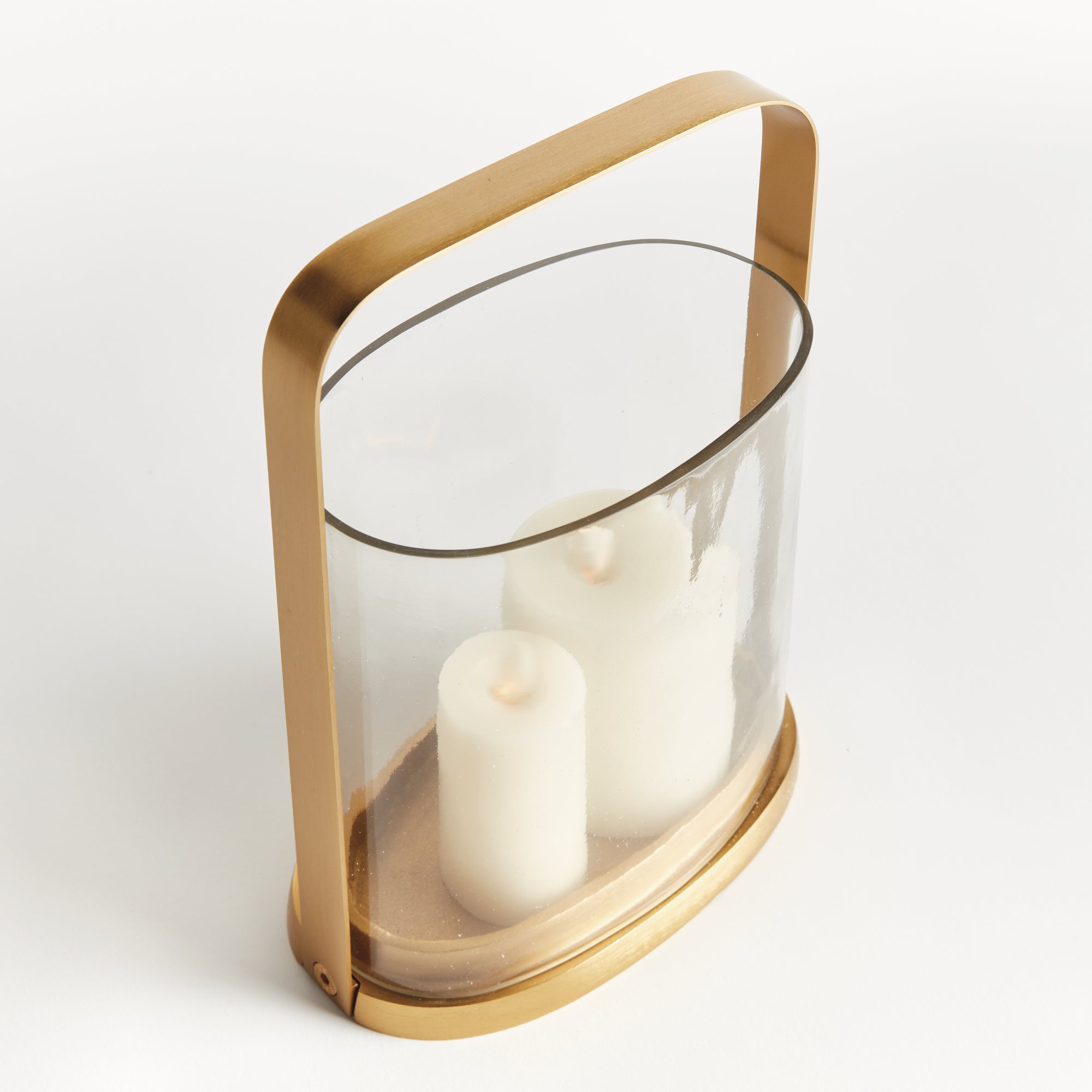 With a rare oval shaped glass hurricane, this unique candleholder is a work of art. The simple design and warm matte brass details only add to it's appeal. Line with candles, and enjoy the warm glow.