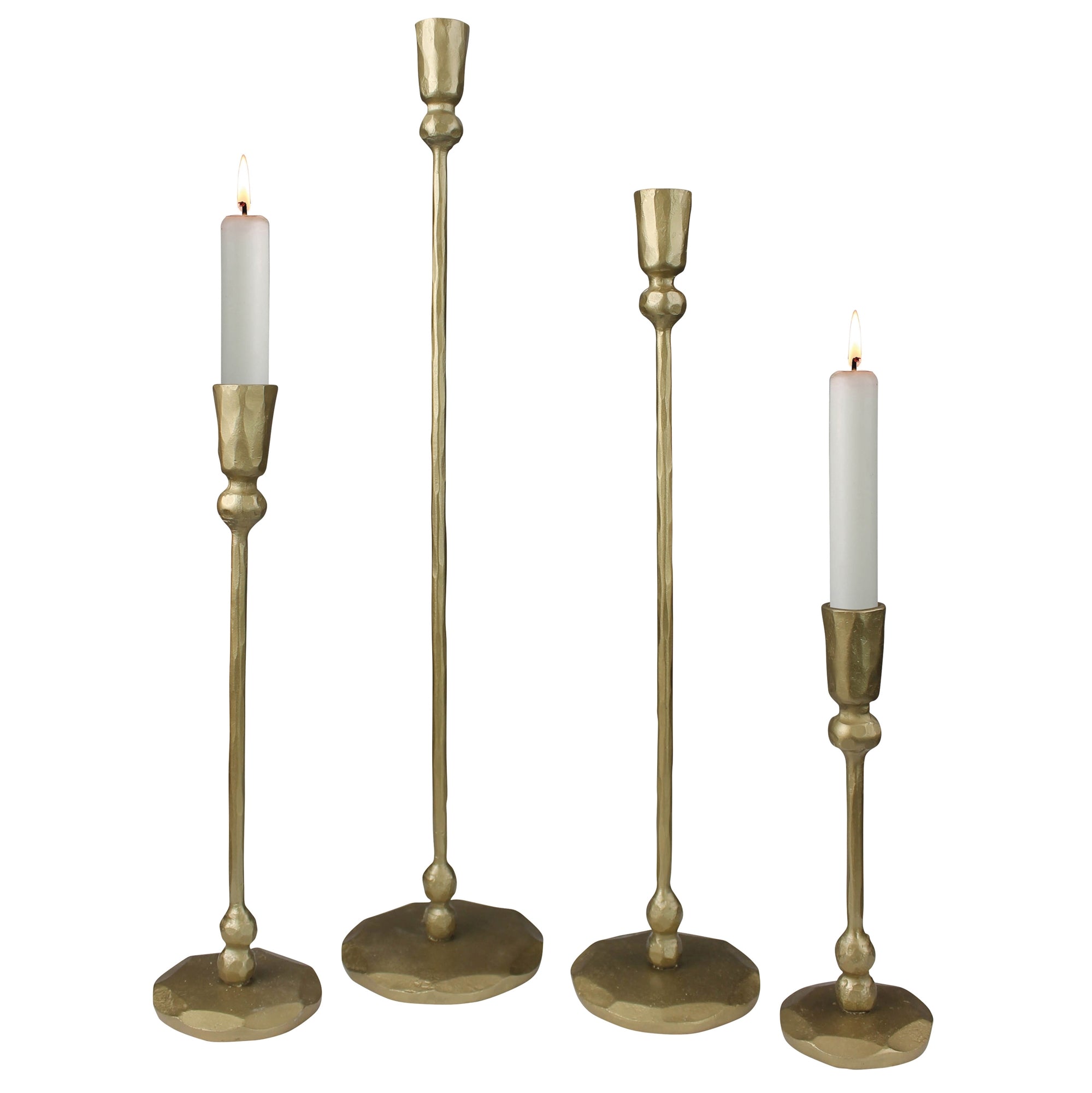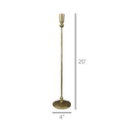 Cast of metal with a fluted taper holder and wide bottom plate this tall and slim taper holder is strong in character when solo and beautiful when amassed. Brass plated. Due to the handmade nature of this product the height will vary 0.5 inches.