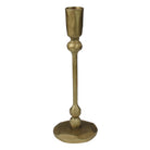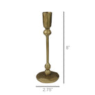 Cast of metal with a fluted taper holder and wide bottom plate this tall and slim taper holder is strong in character when solo and beautiful when amassed. Brass plated. Due to the handmade nature of this product the height will vary 0.5 inches.
