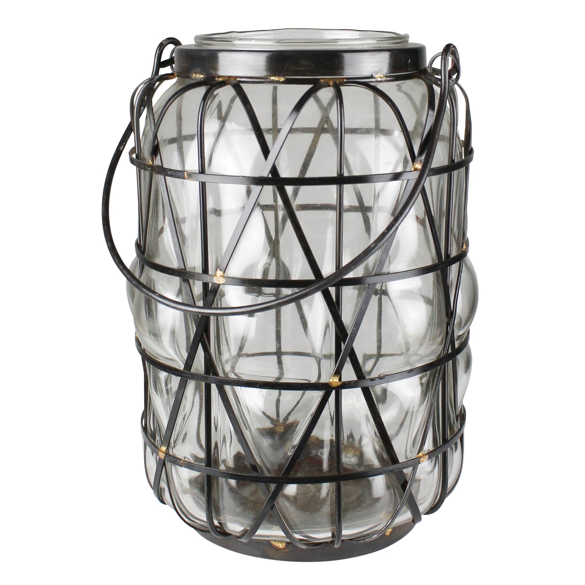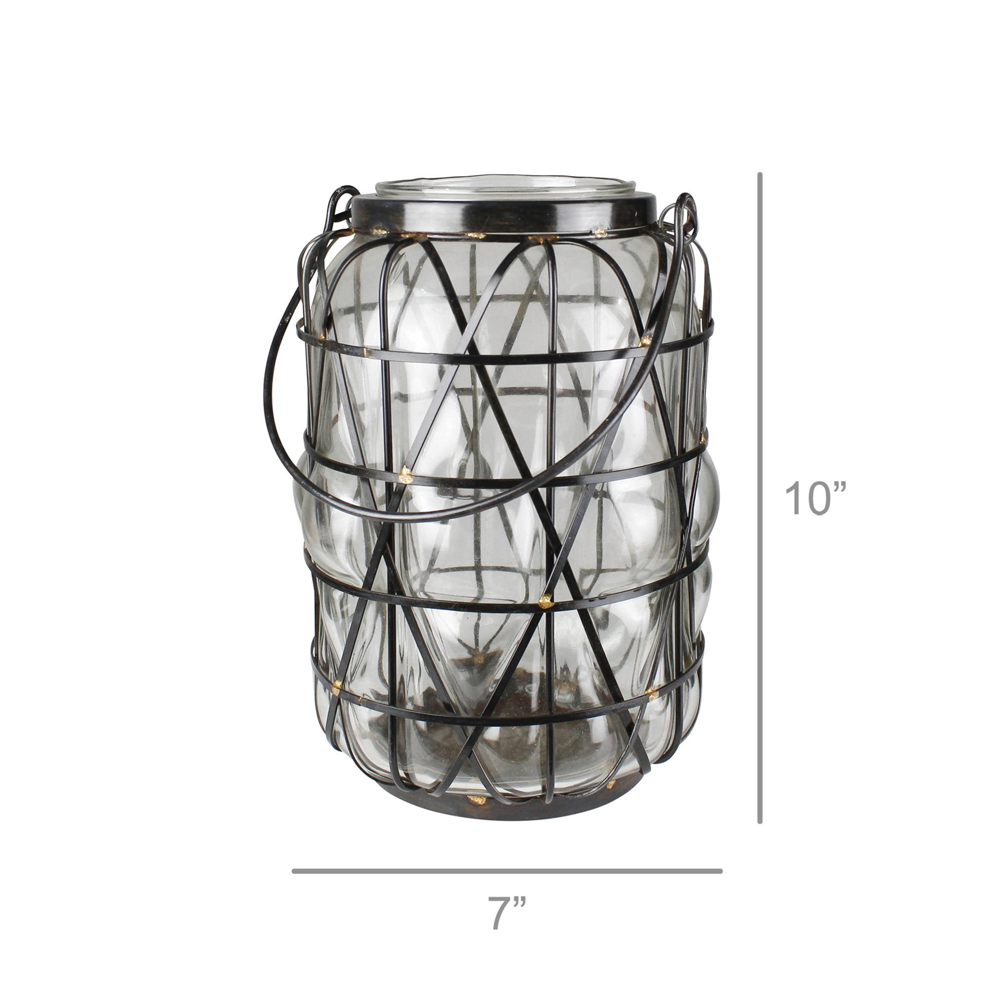 Iron frames are blown into with hot glass, forever encasing the bulbous shapes. The girth of each section of blown glass reflects the candlelight is a luminous way, either sitting or hanging this lantern is your go to for entertaining. 6.5” handle