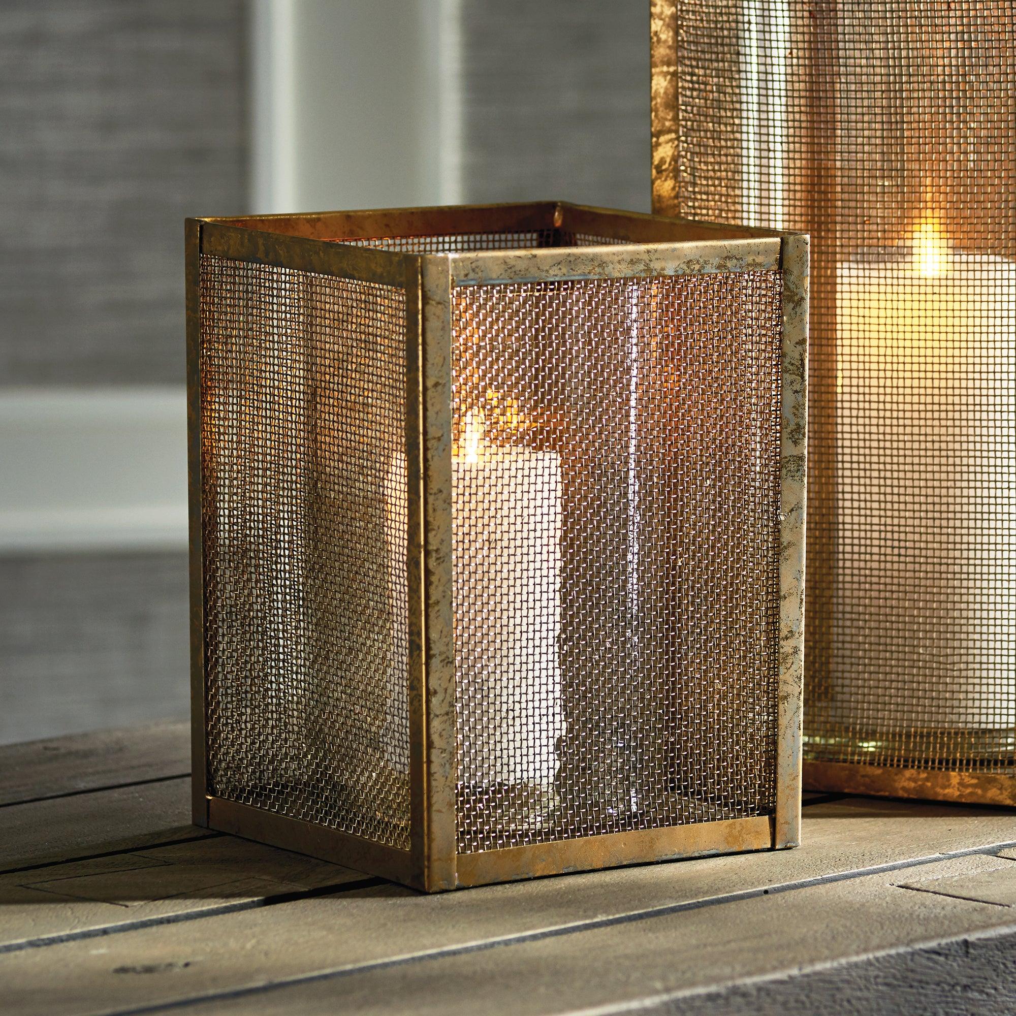 Diego is architectural in design. A light-catching mesh screen in antique gold adds a hint of drama. Complete with glass vases, not hurricanes so as to hold fresh florals as well as candles.