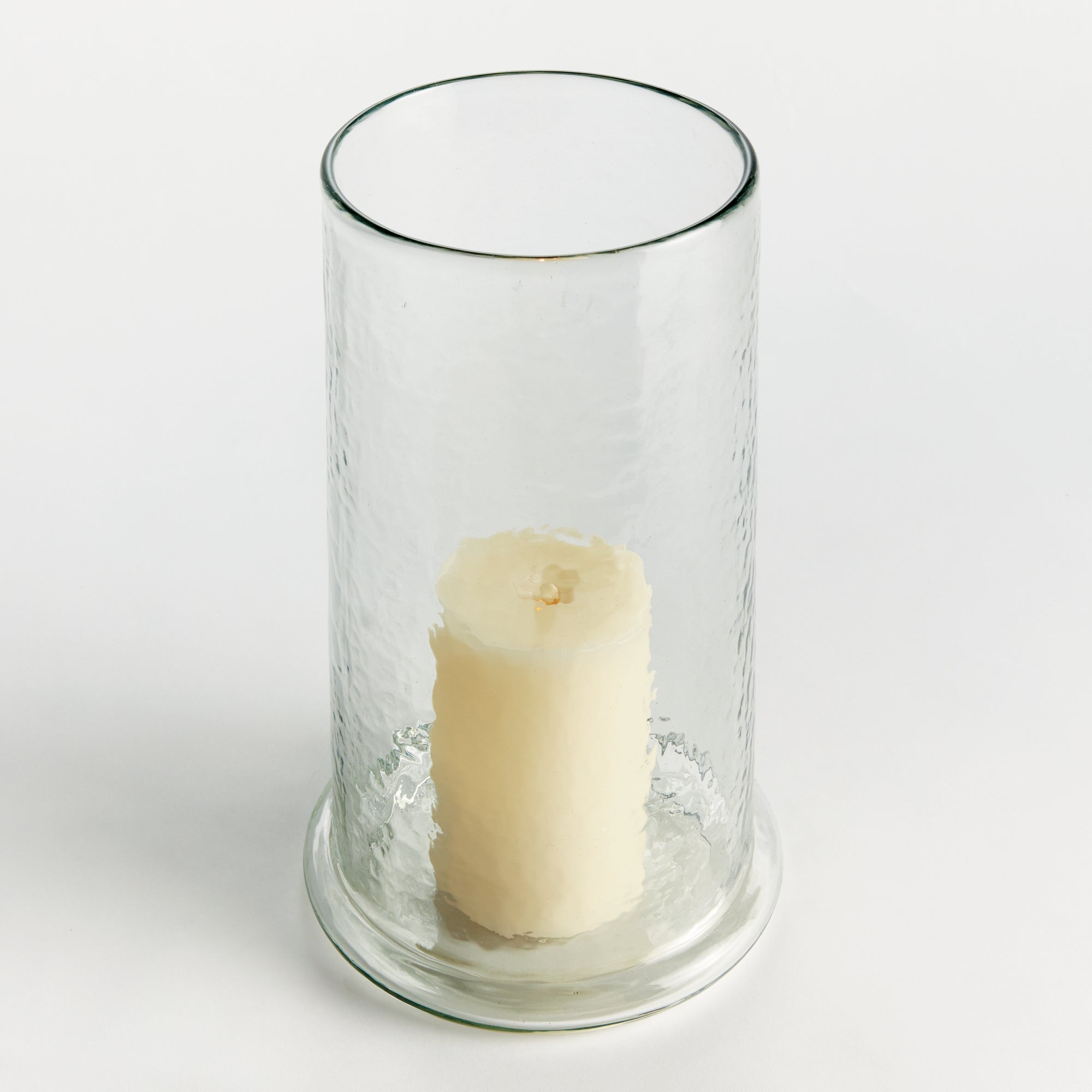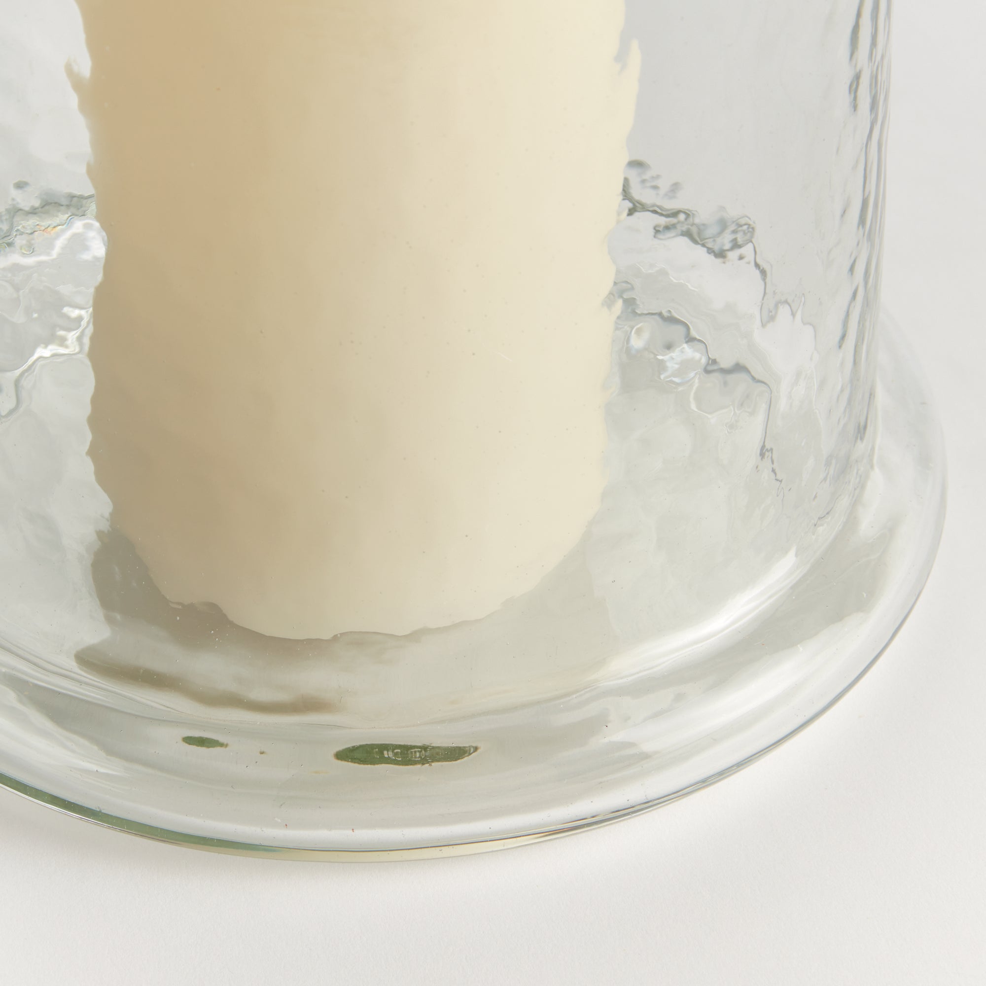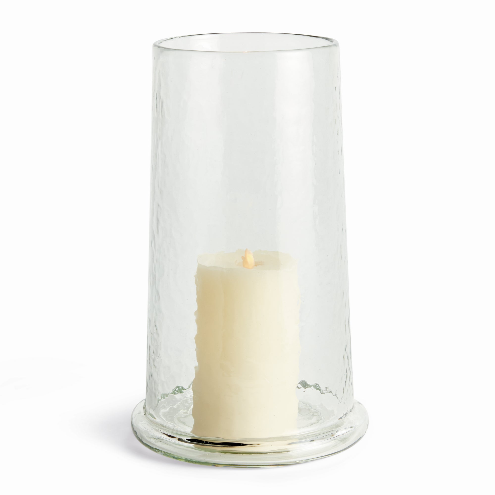 In a tapered silhouette, this mouth blown glass hurricane is a versatile accent. The hammered surface adds a touch of artistry. Feature a warm pillar candle, or add a fresh flower arrangement for a pop of color.