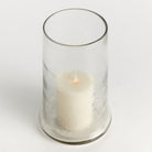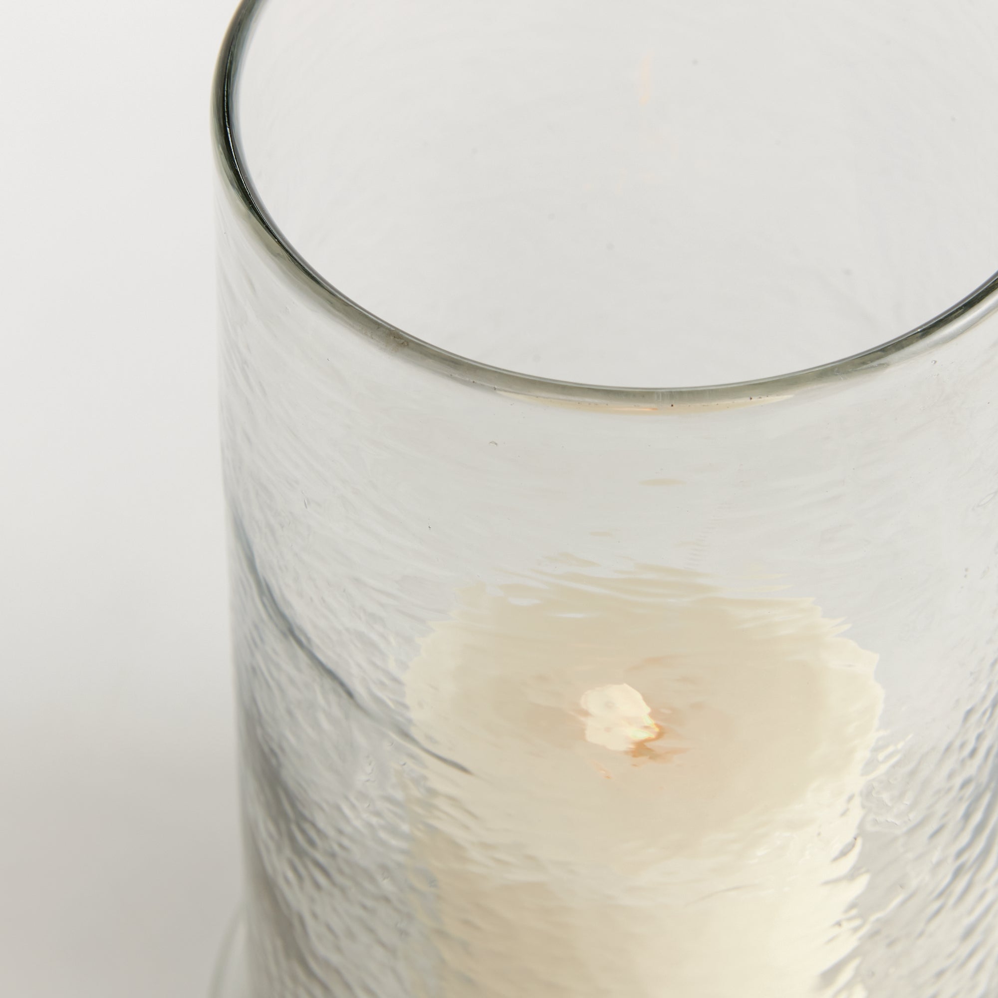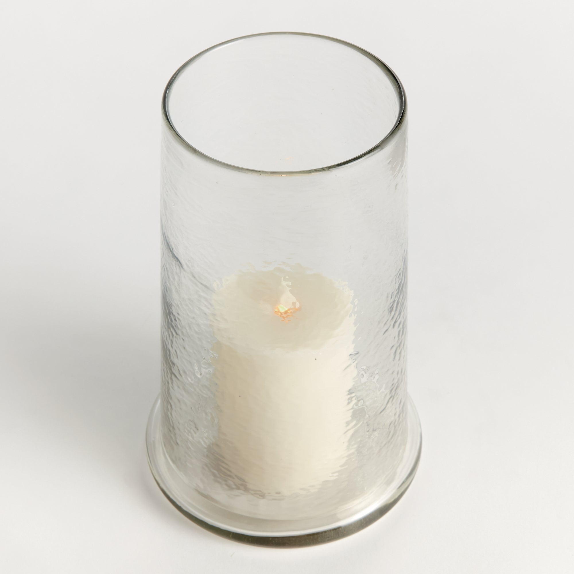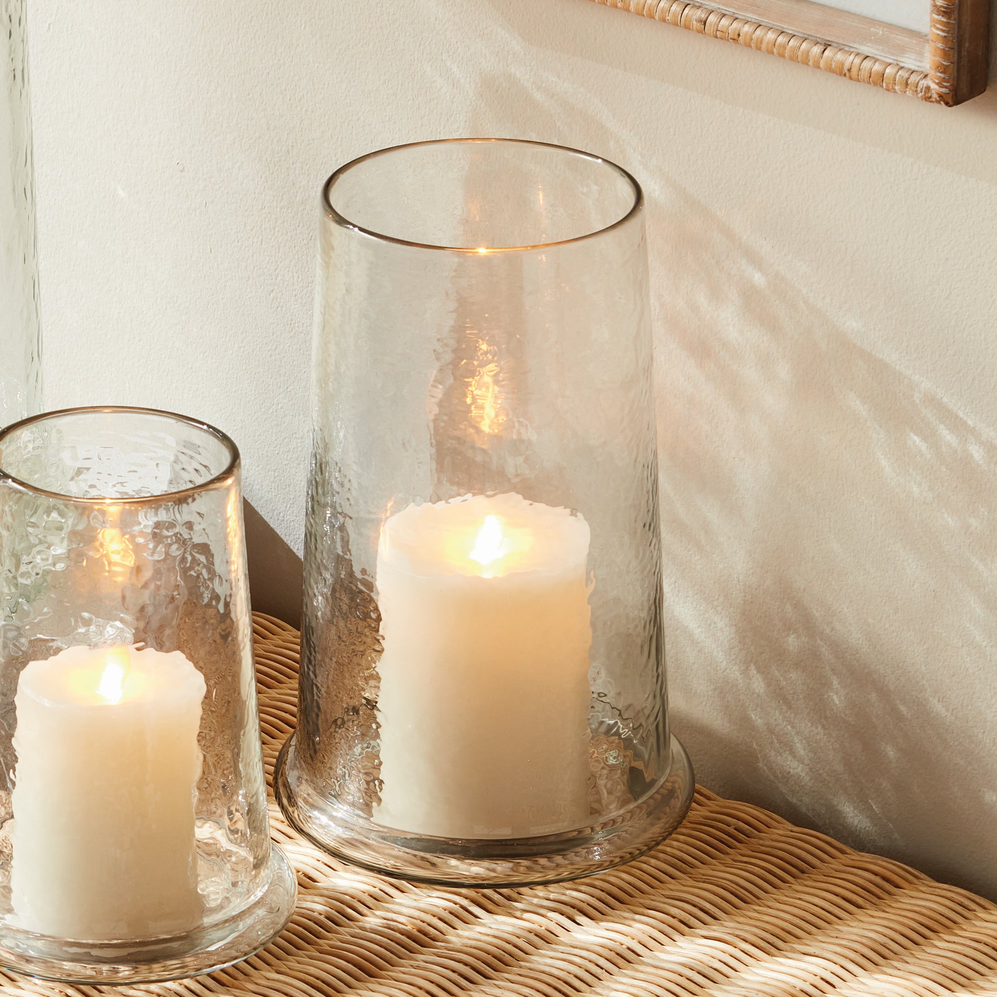 In a tapered silhouette, this mouth blown glass hurricane is a versatile accent. The hammered surface adds a touch of artistry. Feature a warm pillar candle, or add a fresh flower arrangement for a pop of color.