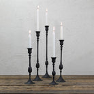 A chic black iron silhouette in a lengthy height boasts the tallest of taper candles.