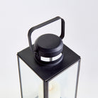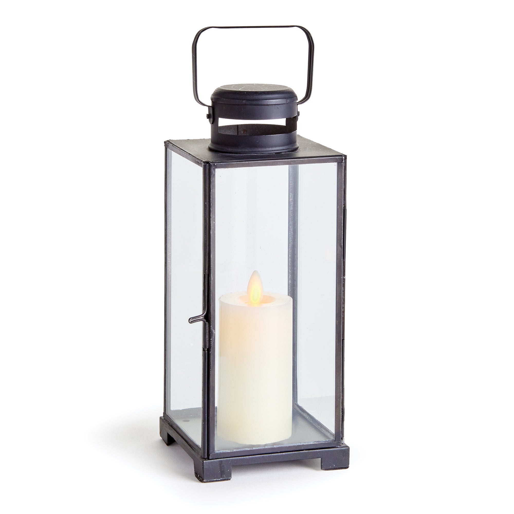 Finished in a warm antique black, this lantern has classic lines and a simple design. With vents in base and top, and clear glass panes, the candlelight shows through brilliantly.