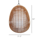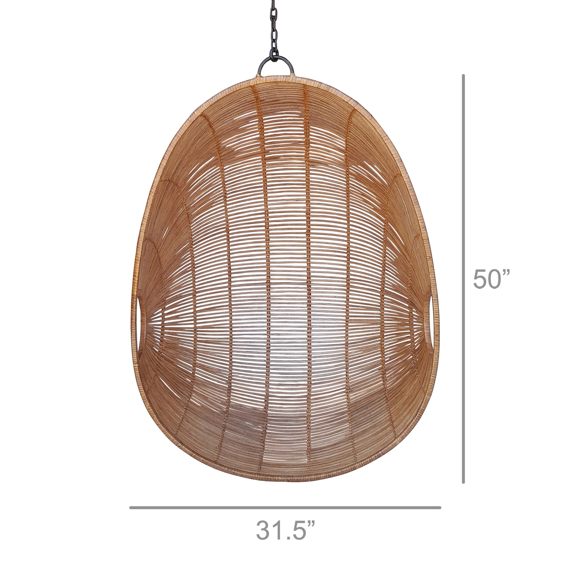 Handcrafted of natural rattan woven onto a wrought iron frame this hanging chair is thoughtfully crafted with gathering, conversation, and laid-back living in mind. Indoor or covered outdoor use reccomended. For indoor or covered outdoor use. To clean wipe with a damp cloth. Due to the handwoven quality, natural materials and dye process some variation is to be expected. 48” Chain Length. Weight capacity 275 lbs.