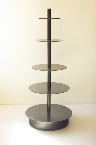 This round iron display stand features five smooth tiers that offer plenty of space for showcasing decor, plants, or merchandise. The simple lines and sturdy design create a sculptural presence that works beautifully in shops, studios, or spacious homes. Closed bottom. KD.