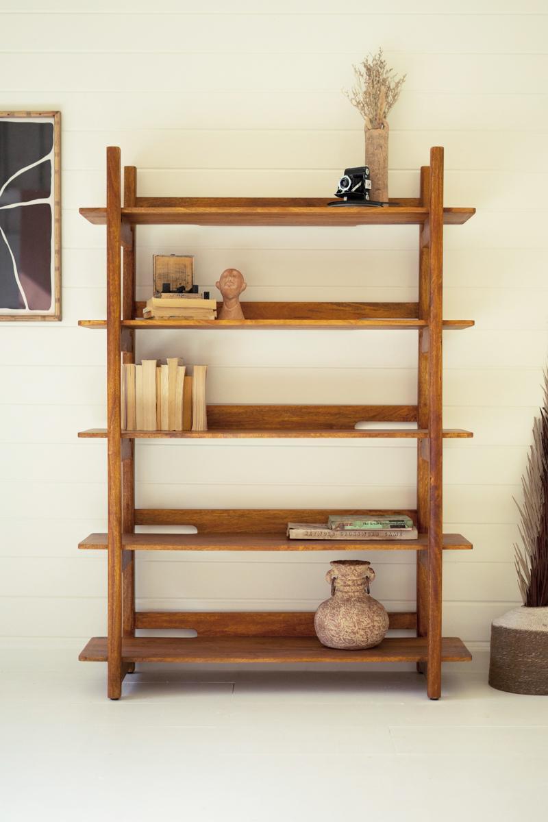 This mango wood bookshelf with teak finish pairs with coffee table and console table for a living room suite. Display all your favorite finds from fiction to flora on this five-shelf case.