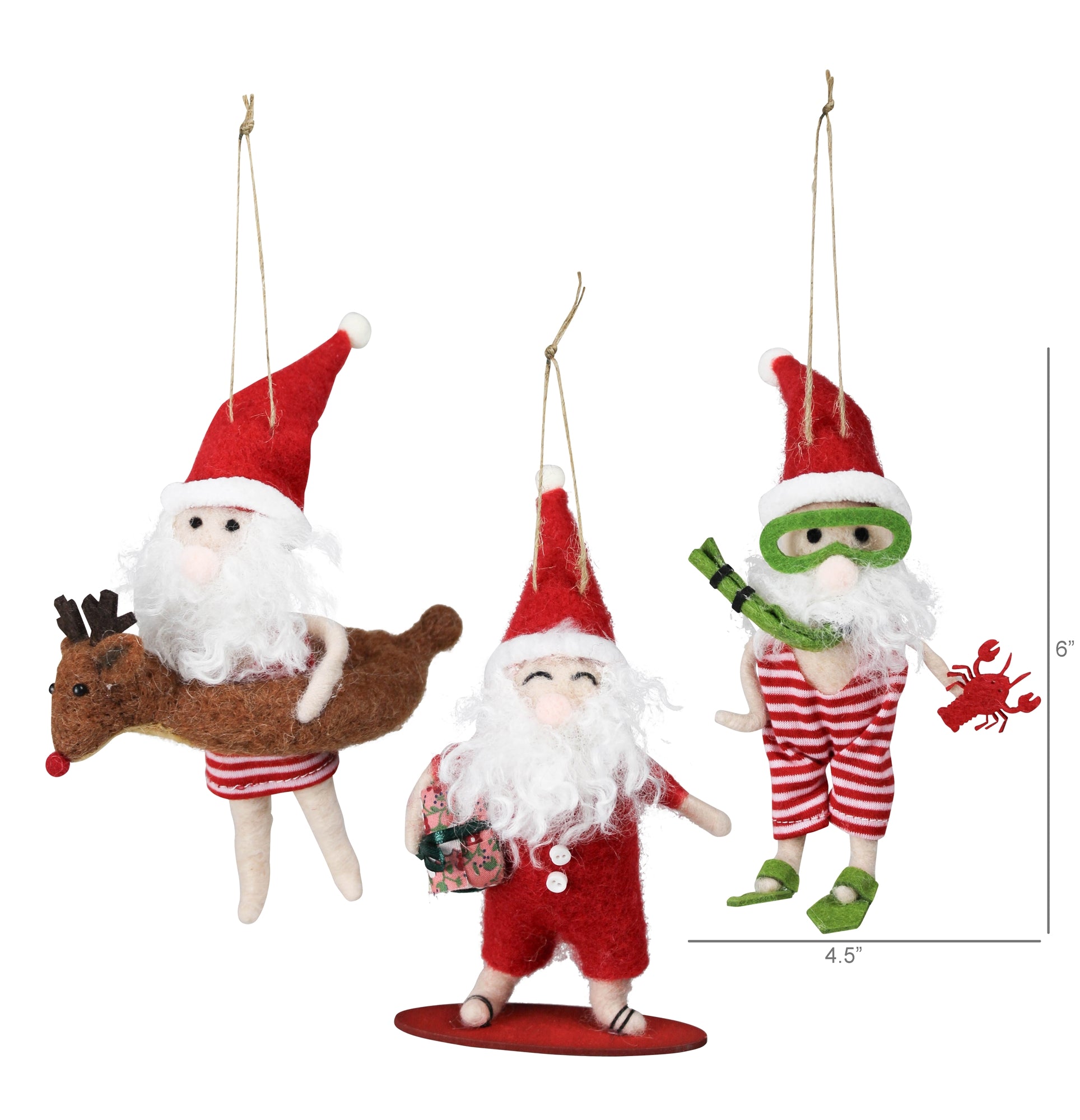 Bring a sunny twist to your holiday decor with this set of 3 felt Beach Santa ornaments. Each one, adorned in vibrant beach attire, captures the festive spirit with a laid-back, coastal charm. Perfect for adding a fun, tropical touch to your tree.