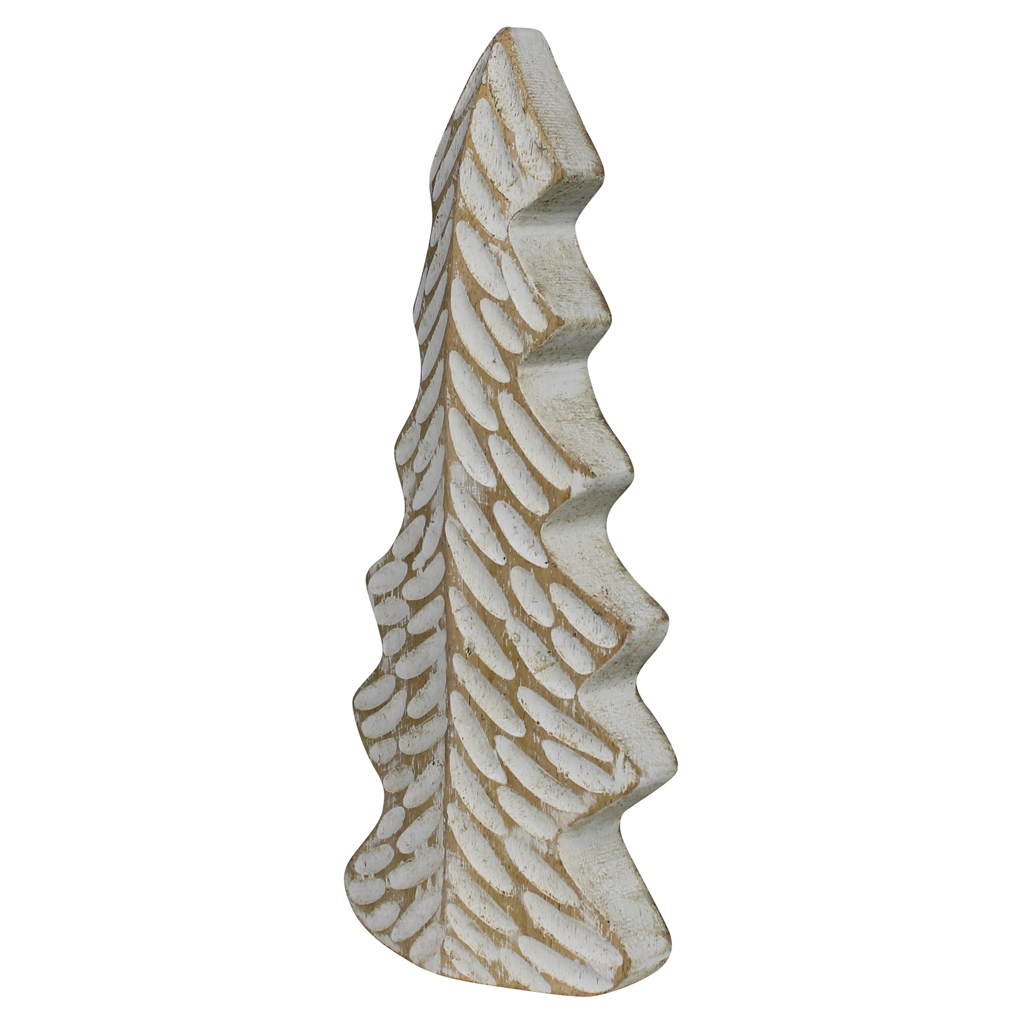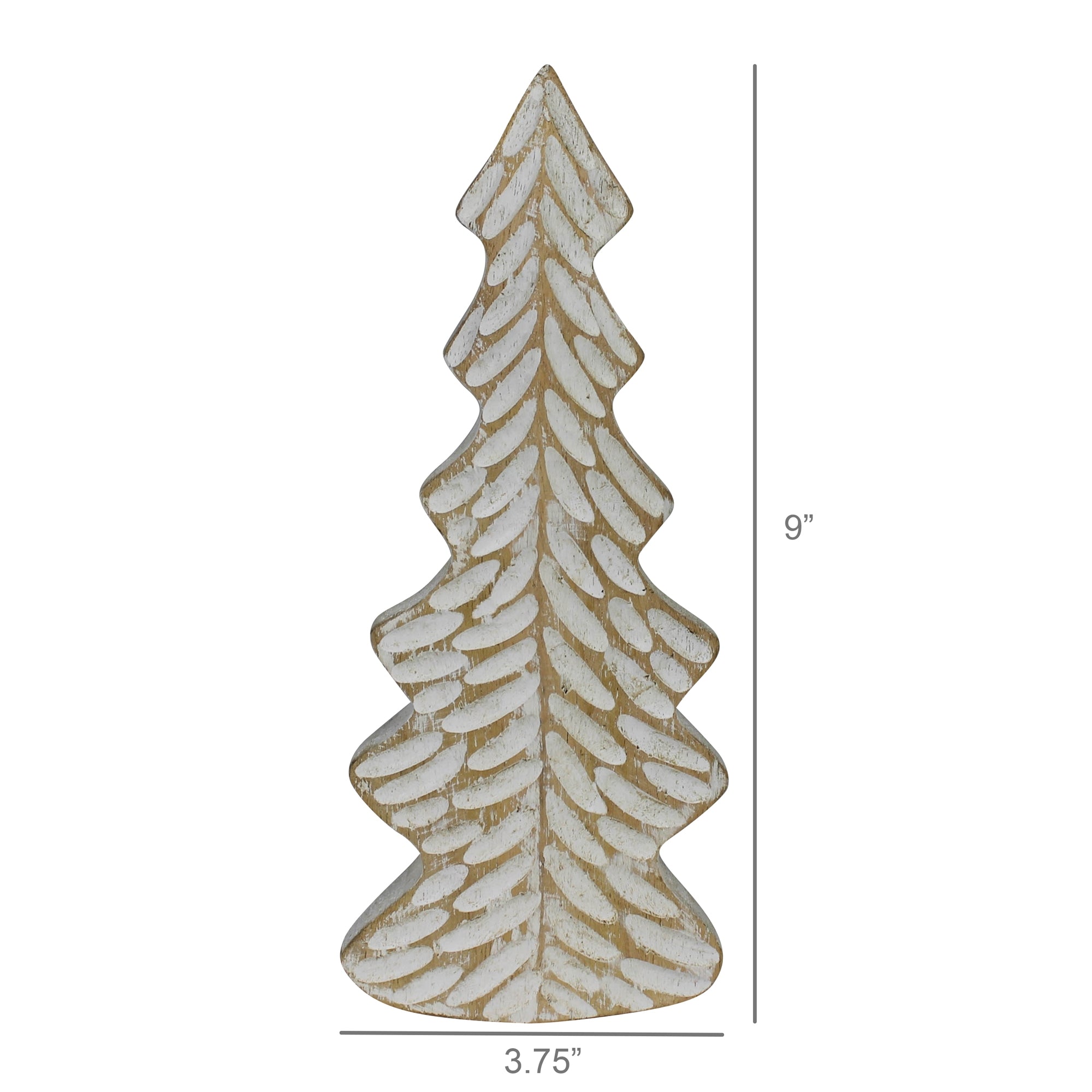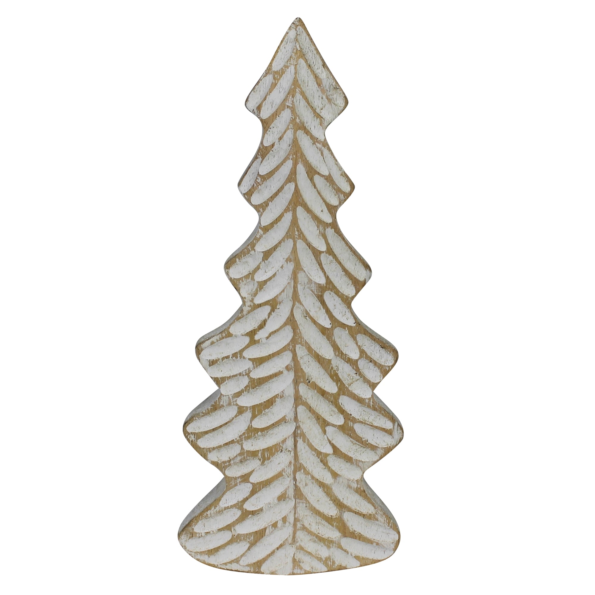 The limbs of this wood tree are hand carved and painted in a distressed white giving the feel of barren patches left from fallen snow.