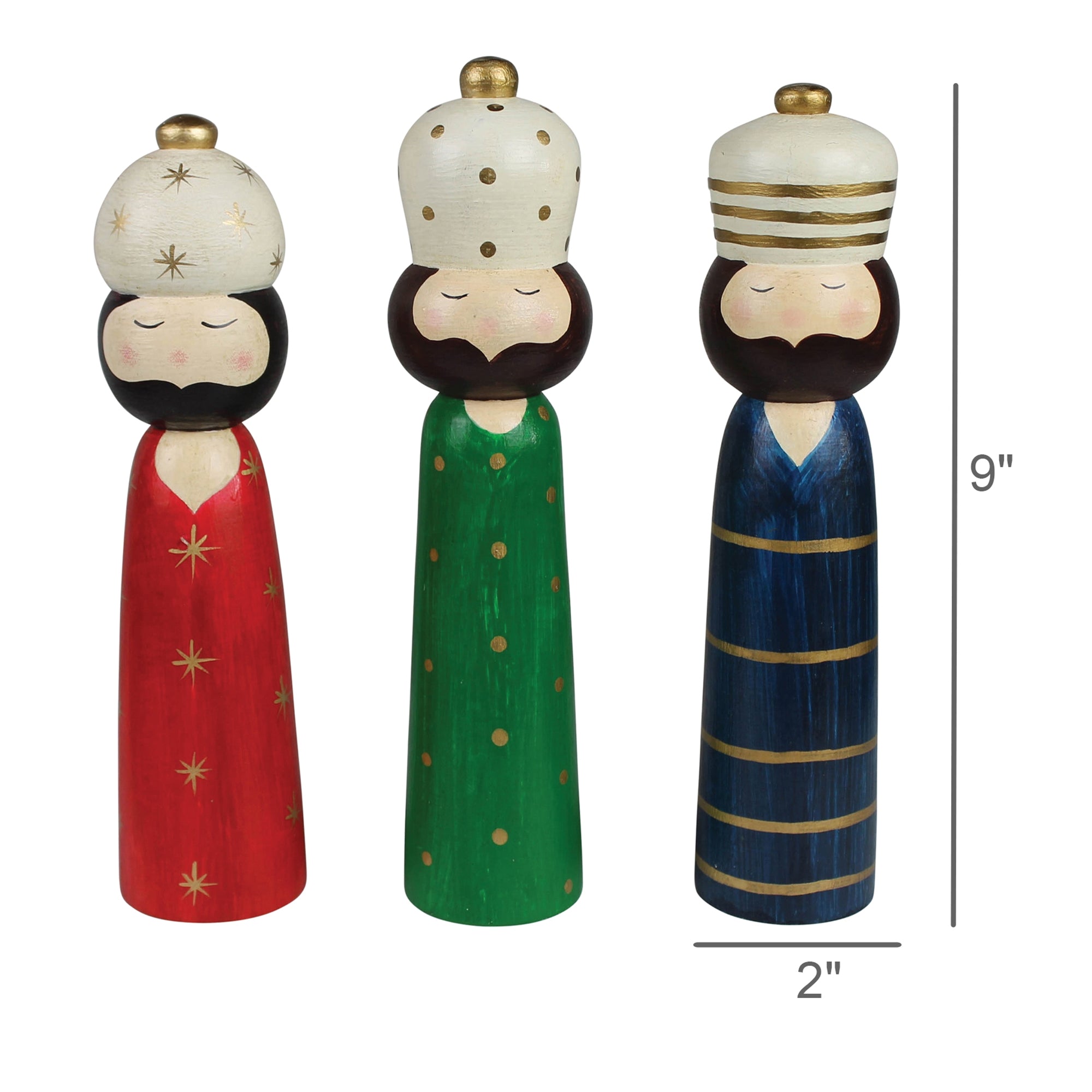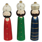 Carved from wood the stoic postures of these Three Kings are offset by their whimsical crowns, sincere eyes, brightly colored coats.
