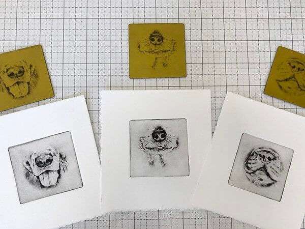Pre-made mini etchings ready to ship! I can personalize with your pet’s name as the title of the artwork.