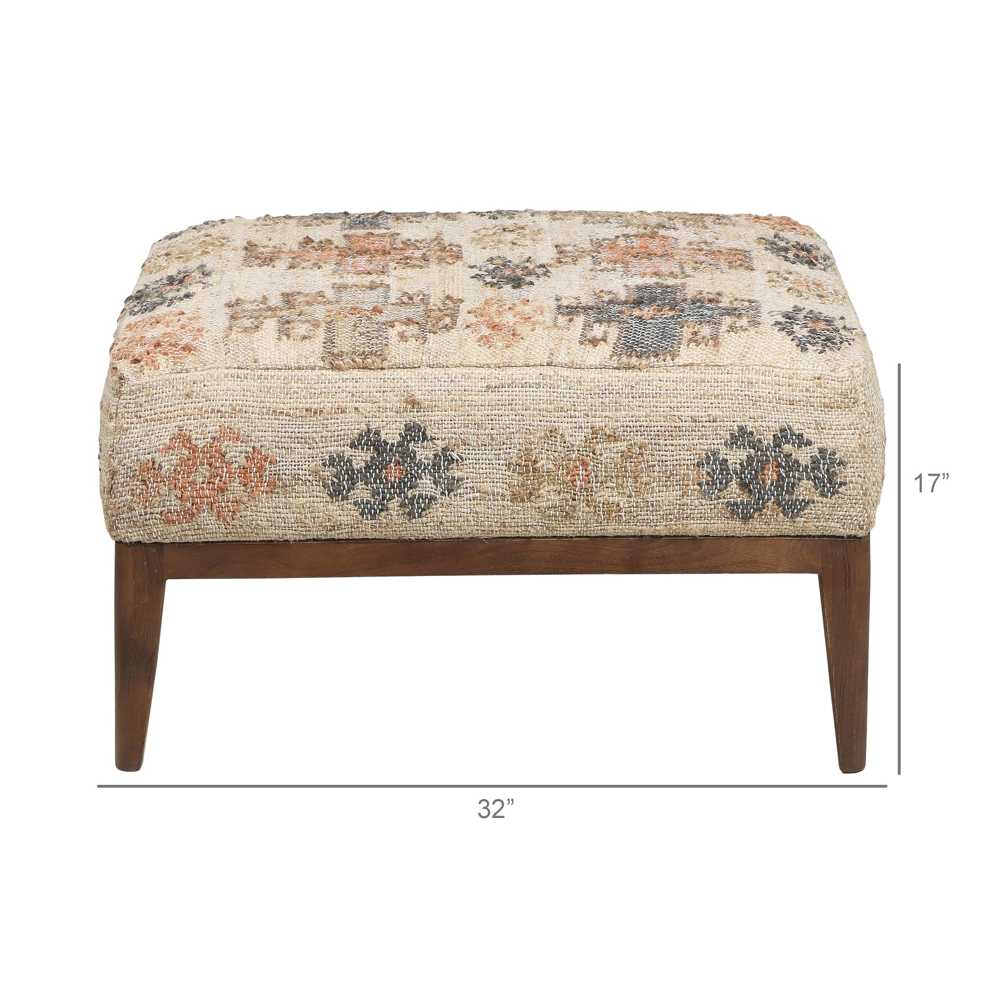 A kilim textile in a Moroccan inspired pattern is woven of jute and cotton and covers this statement ottoman, the perfect spot for extra seating or add a tray and it's an instant coffee table. Mango wood legs.