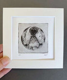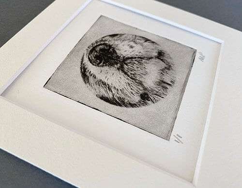 Pre-made mini pet portrait etchings ready to ship! I can personalize with your pet’s name as the title of the artwork.
