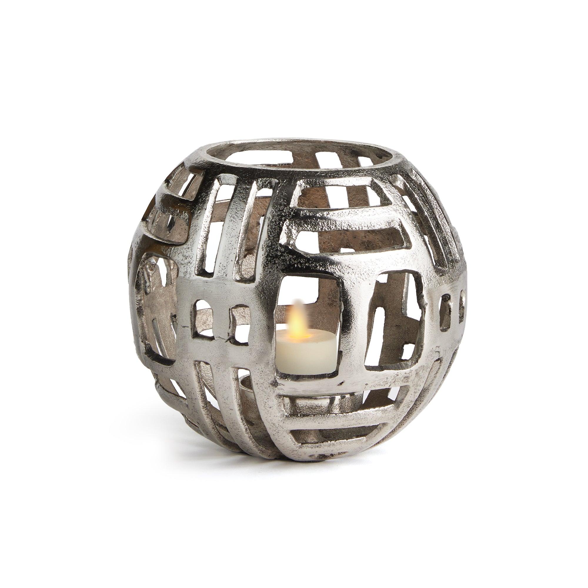 Made of sturdy cast aluminum and designed with alternating horizontal and vertical linear cut outs, this rounded hurricane frames your candle in modern style. A fresh accent for console or side table.