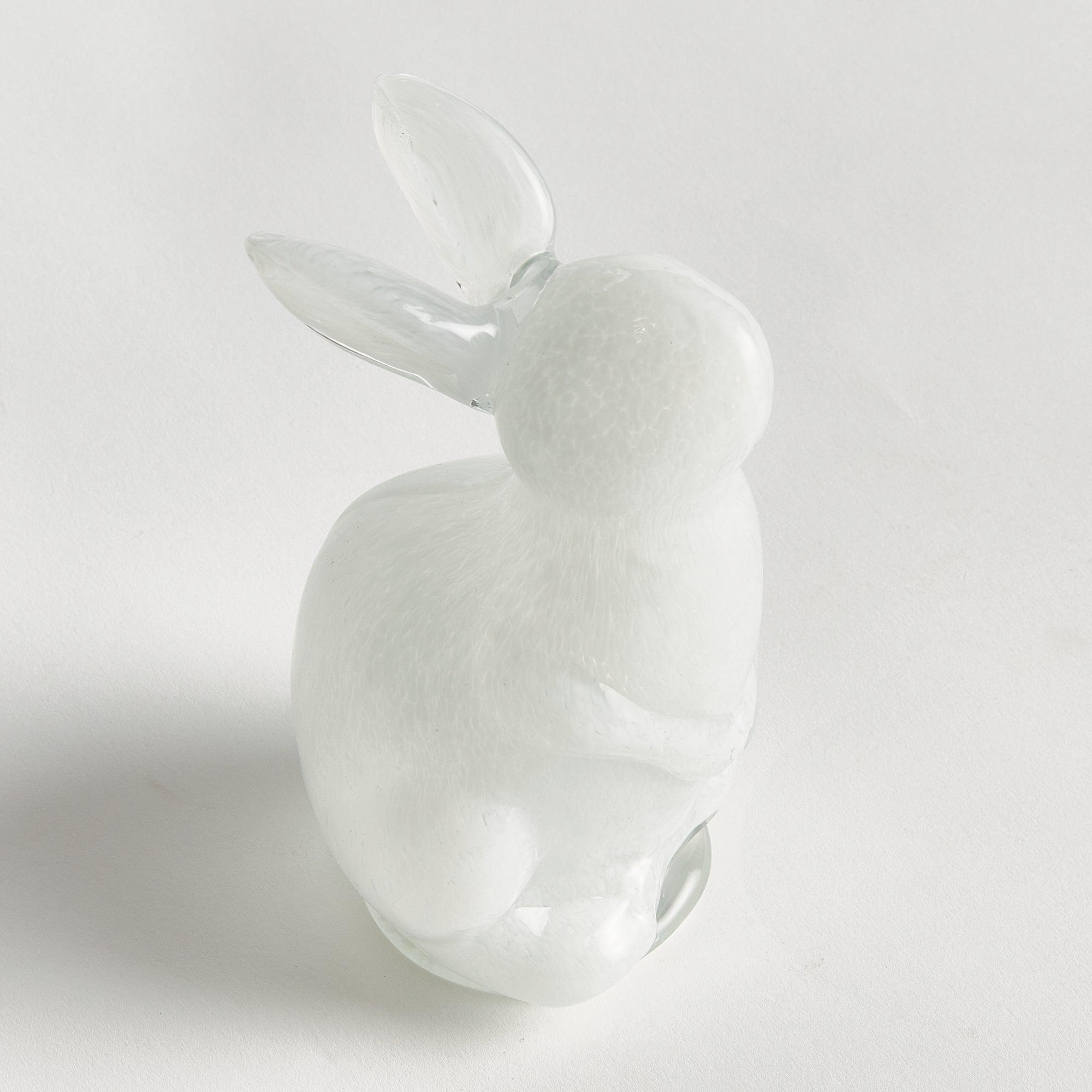 Our hand blown and molded glass bunny sculpture is simply adorable in Spring or even year round. The color is added to glass during heat process, not sprayed. A classic design in a bright white. A cheerful touch of color to adorn your side table, coffee table or ottoman.