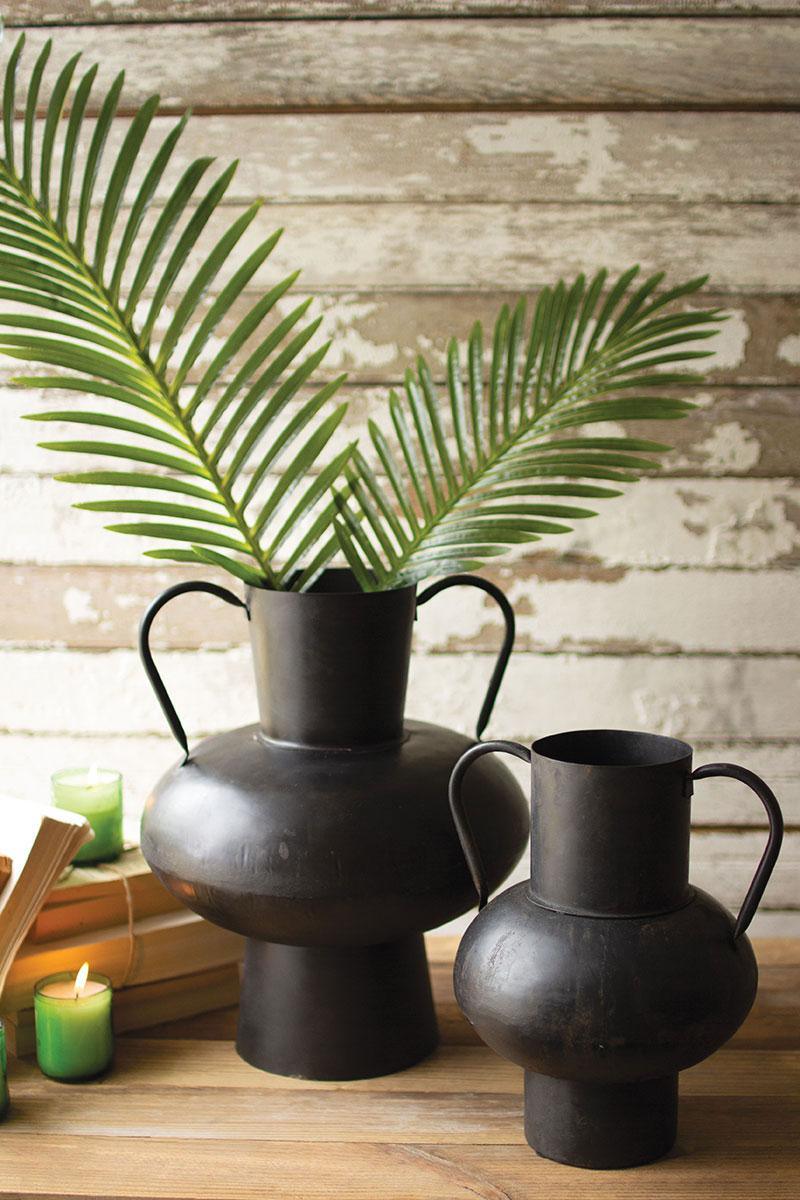 These metal urns with handles offer a modern and simple look to any table! Once you add a plant it is sure to brighten up a room and draw one's attention to it.