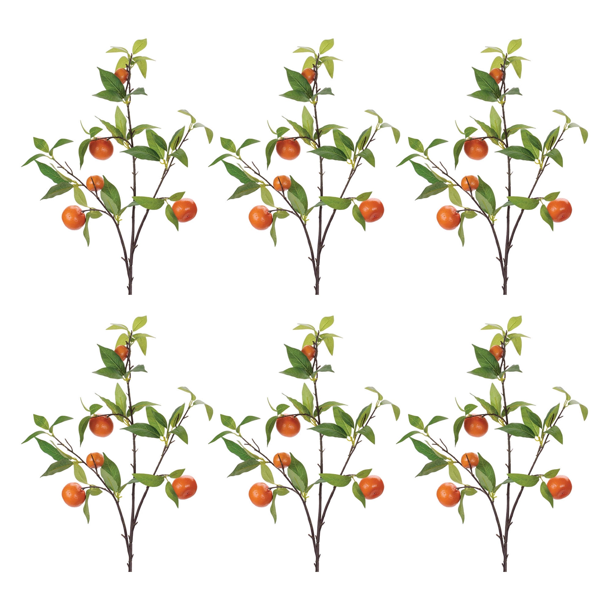 Infuse your home with vibrant, orchard-fresh charm using this set of 6 Orange Fruit Foliage Branches. Each 34" stem showcases bright orange fruit nestled in lush green leaves, evoking a cheerful, sun-kissed vibe. Made with realistic polyester and lightweight styrofoam, and supported by flexible iron-wired stems, these branches are perfect for creative displays. Use them in vases, garlands, or wreaths to bring a juicy pop of color and natural texture into your seasonal or everyday decor.