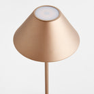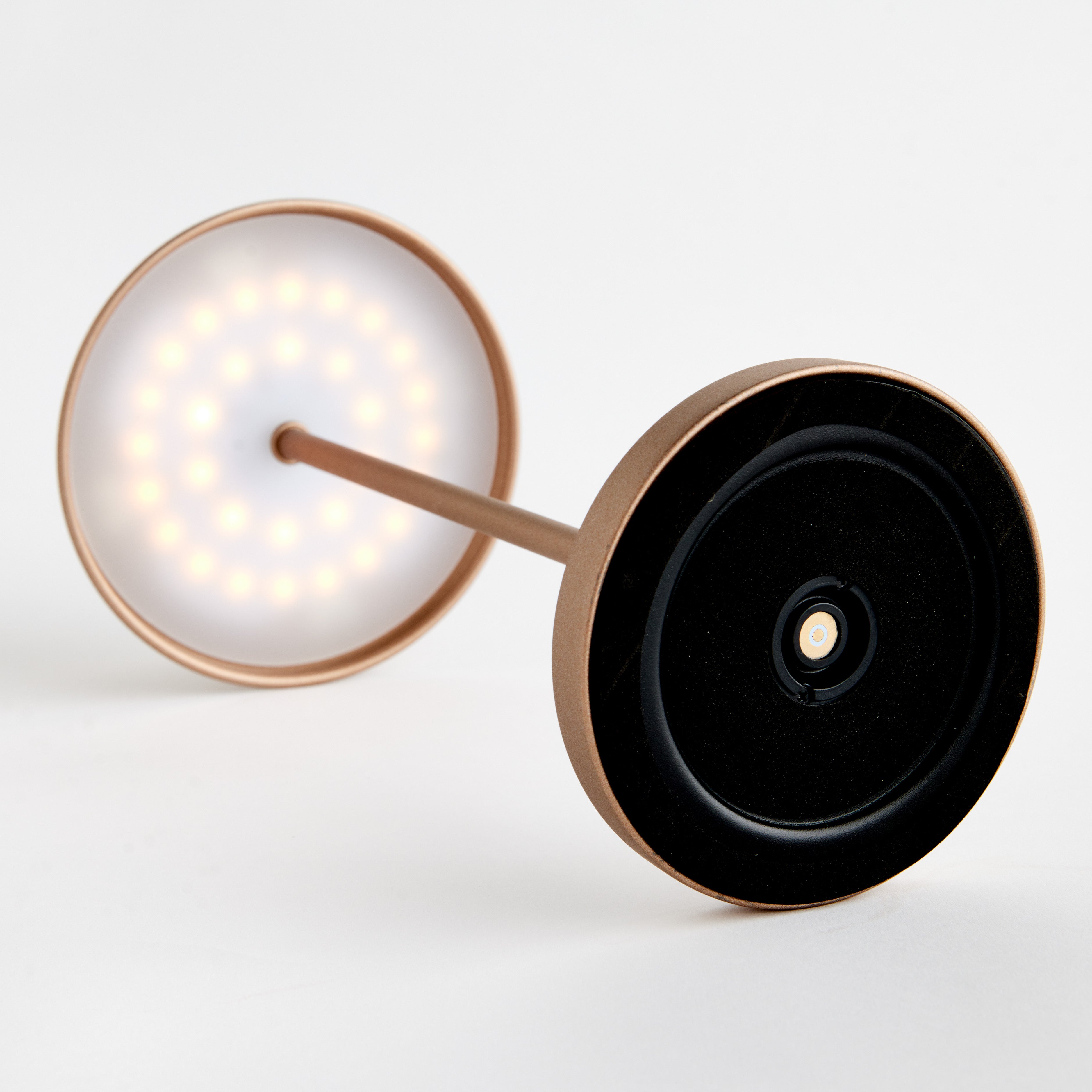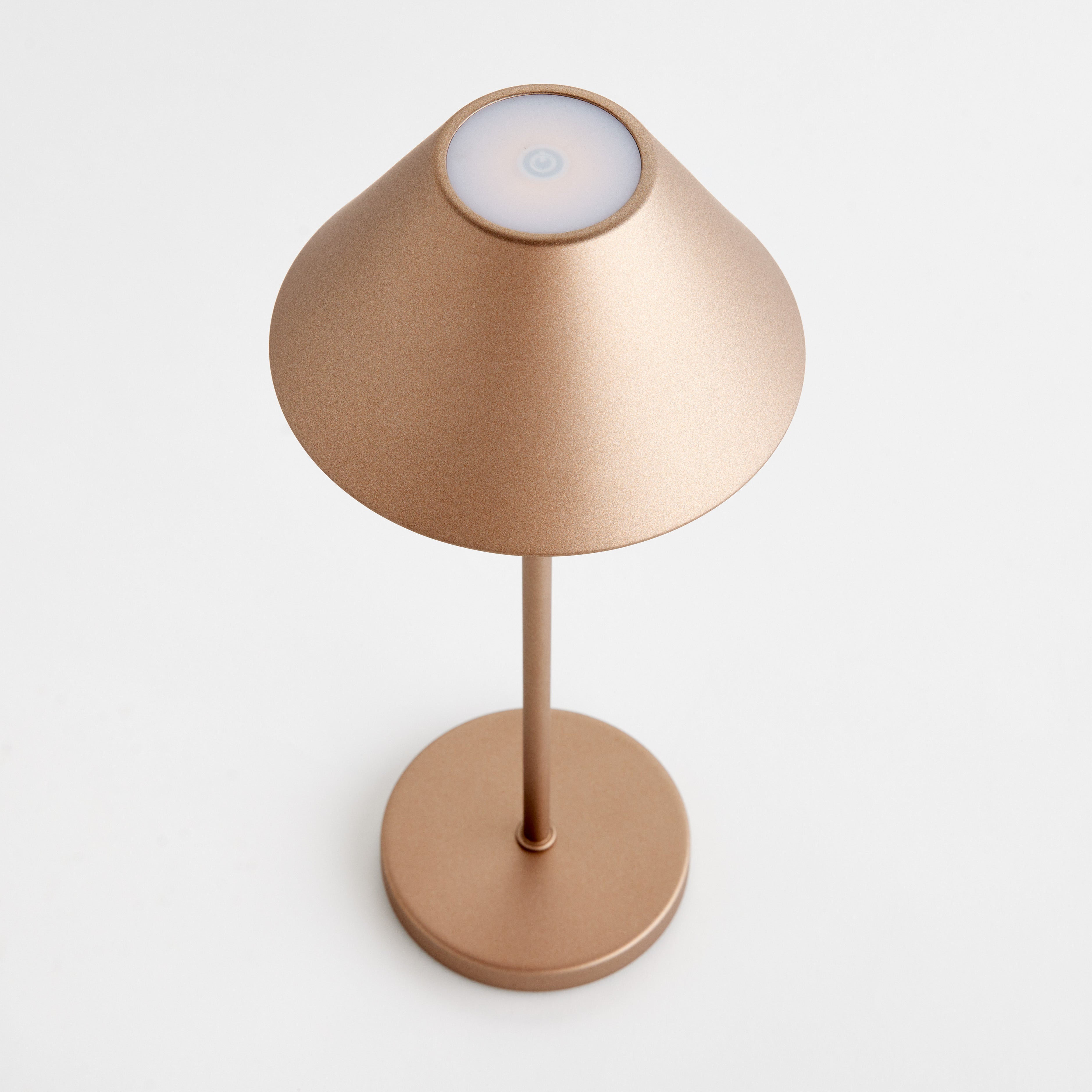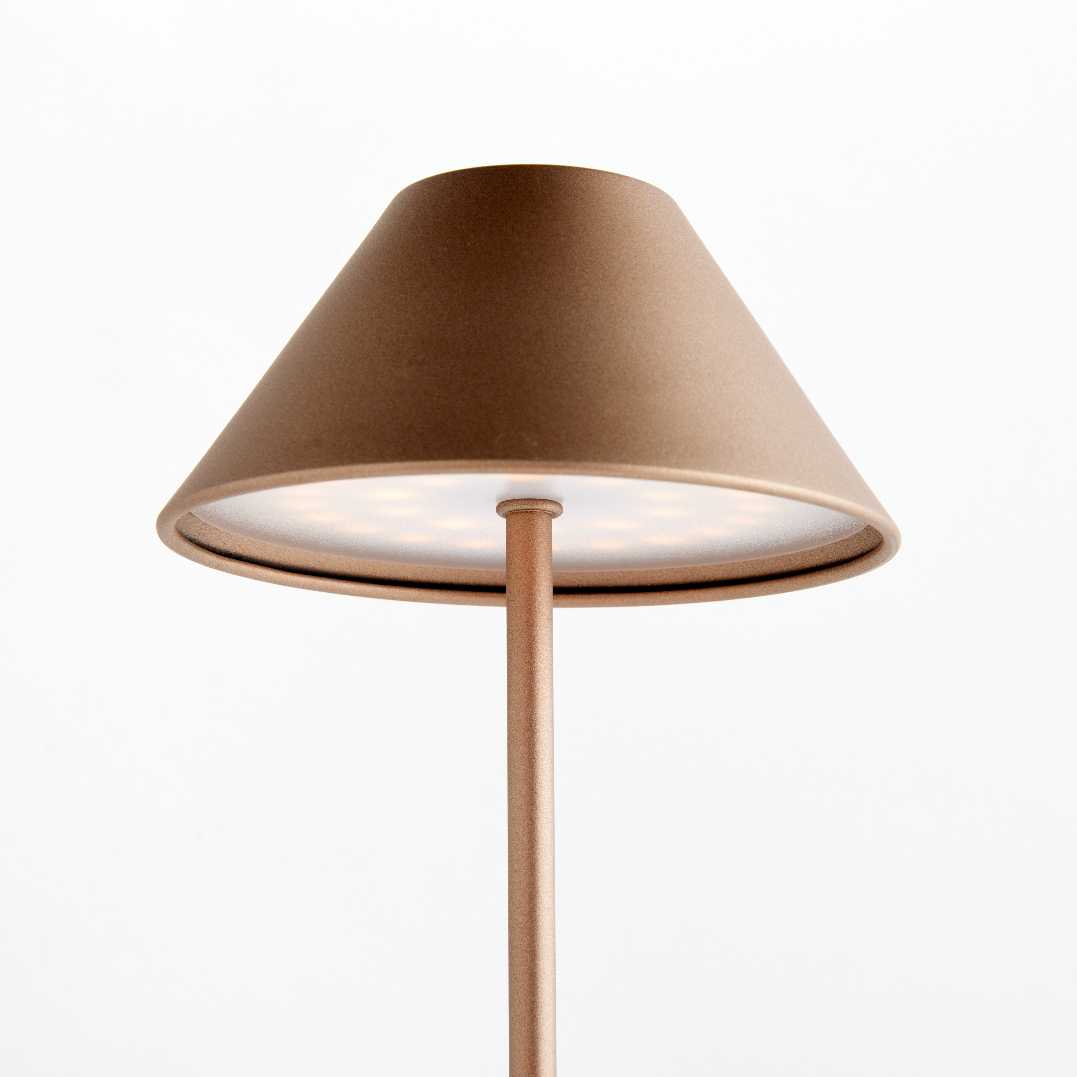 -Bronze;-Easy touch On/Off and brightness settings: Candlelight (2200k), Warm White (2600k), Cool White (3000k);-Light longevity at full charge: 10 hours at full light intensity;-Total lumens: 200;-Charge time: 6 hours;-Charging station with USB- A cord included;-Shade material: metal;-IP44 rated for damp conditions