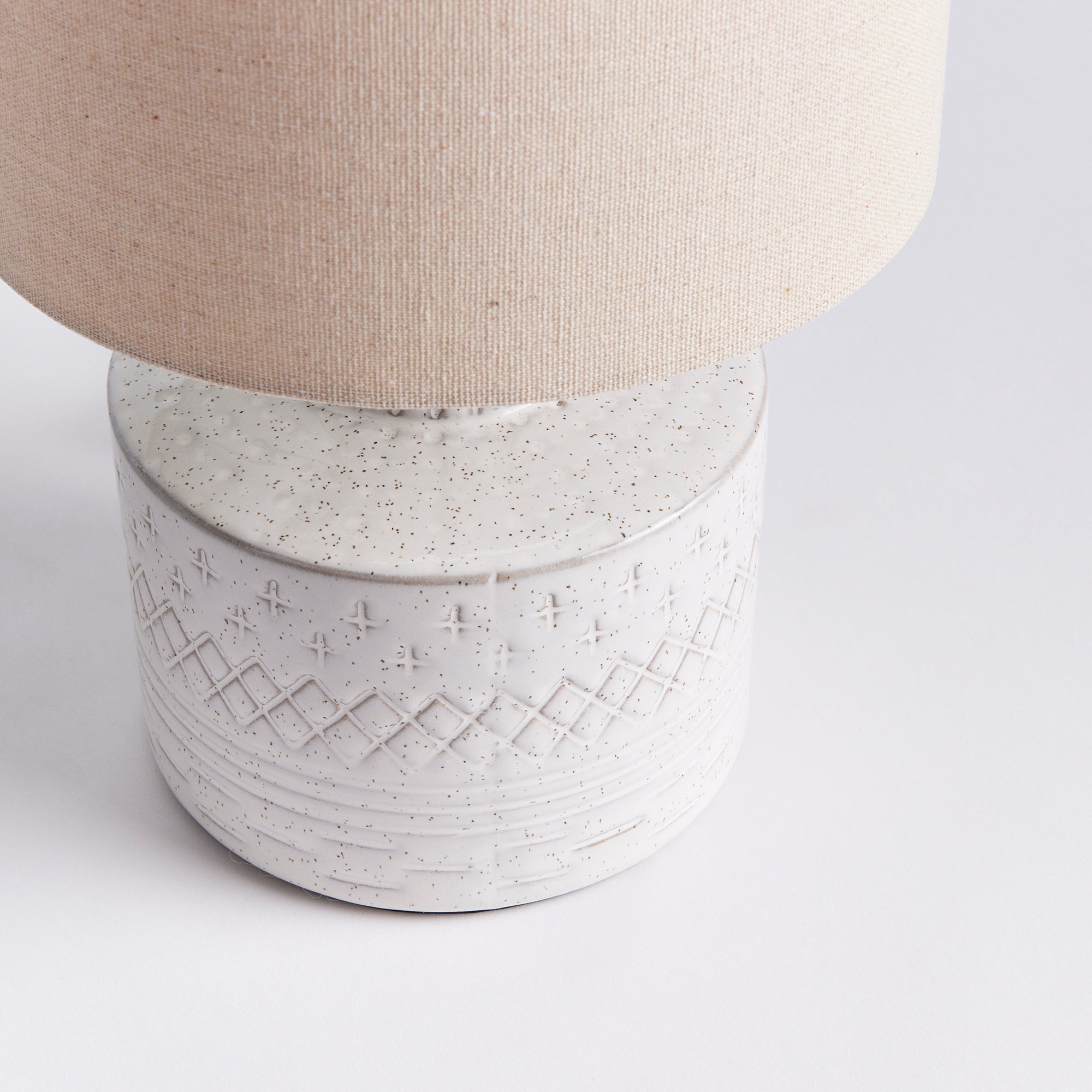 A ceramic base, this little lamp has a speckled, reactive glaze that plays off the carved graphic pattern. Topped with a natural linen shade, it is as whimsical as it is well-crafted.