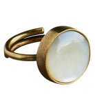 Natural materials - Brass and Mother of Pearl - are sourced from the land and the sea and are bezel set onto an adjustable ring.
