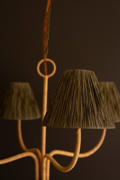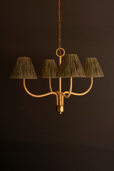 This chandelier combines natural materials with graceful form, featuring raffia-wrapped shades that bring warmth and texture to the room. The four evenly spaced lights cast a soft, inviting glow, while the elegant frame offers balance and height. Ideal for creating a relaxed yet sophisticated atmosphere in dining rooms or entryways. Brown cord. Gold chain and ceiling cap.
