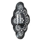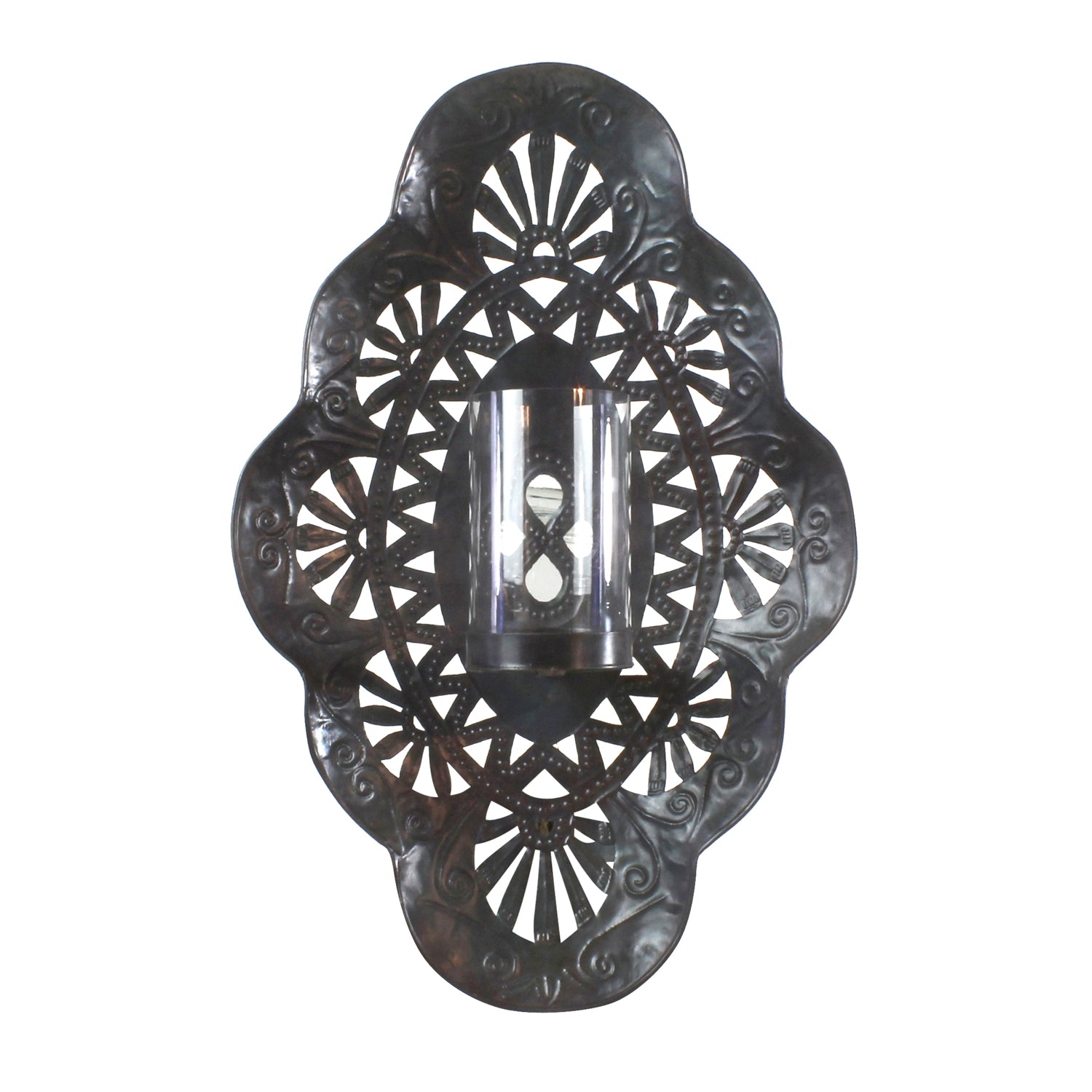 Mexicana details and Indian craftsmanship fuse together in the Sala Wall Sconce, fashioning a candlelight fixture that evokes the boldness and glamour of a bygone era. Burnt waxed metal creates a deep, dark finish. Removable glass hurricane included.