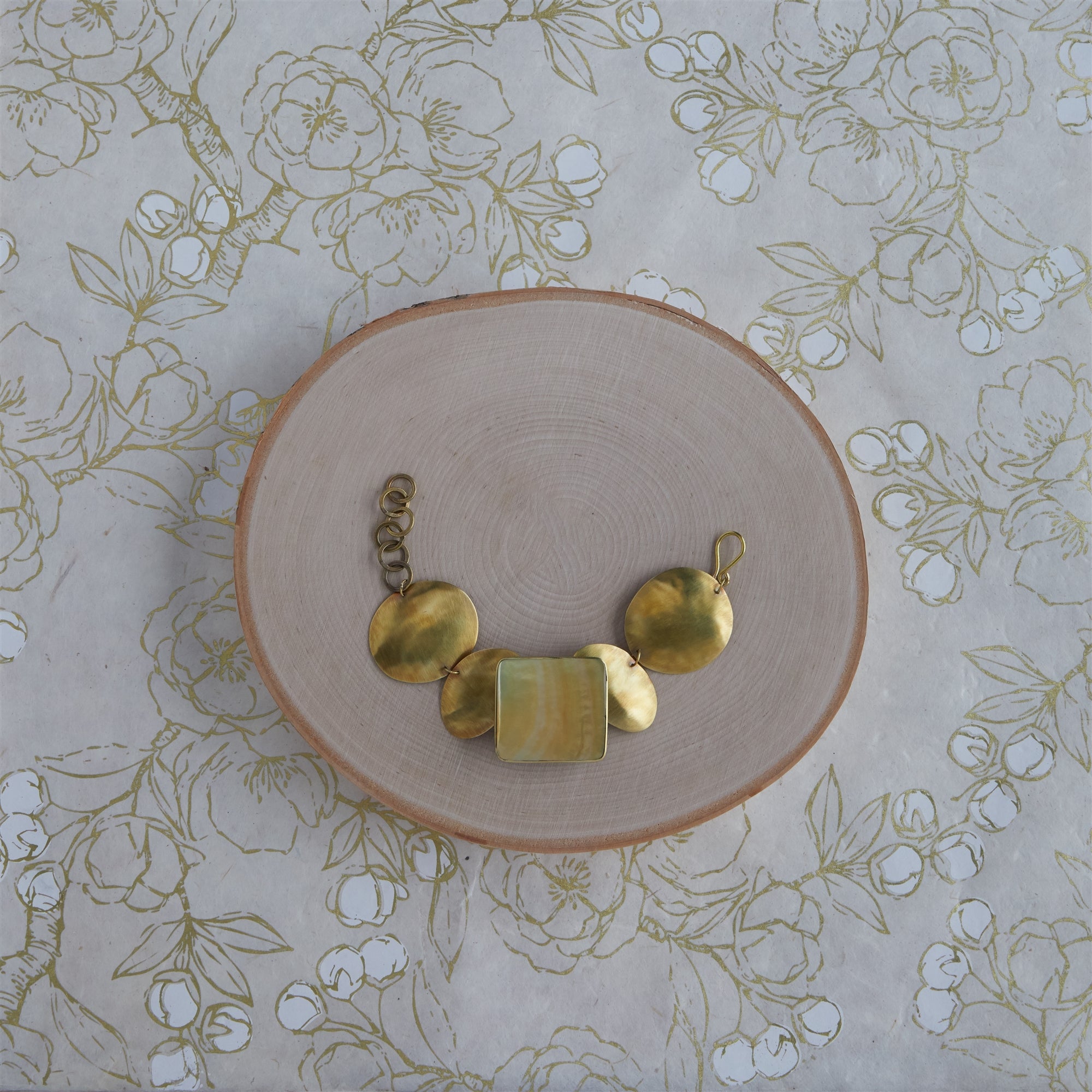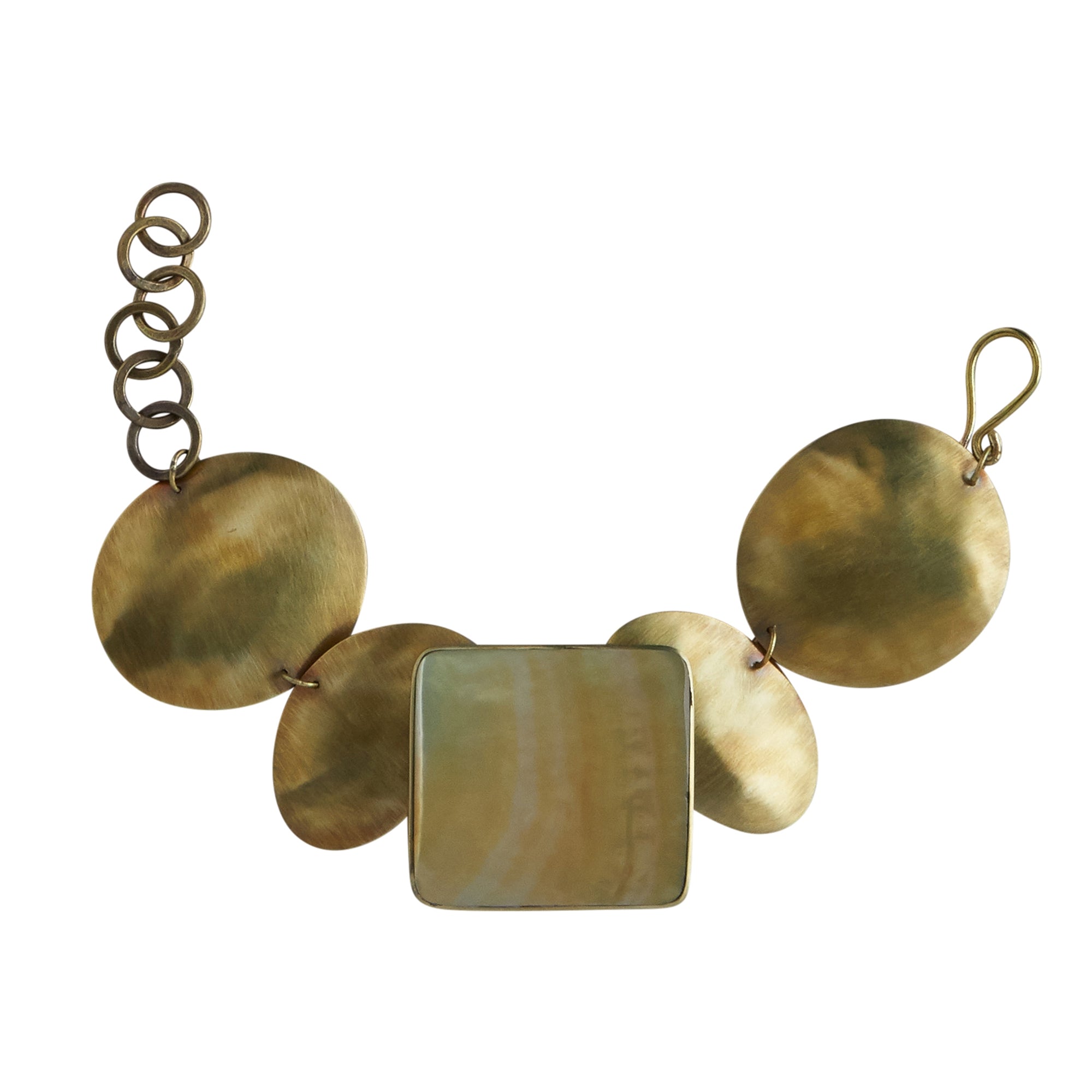 Squares of natural Mother of Pearl are bezel set and linked with convex brass ovals, fashioning a statement bracelet that lays beautifully on the. Adjustable.