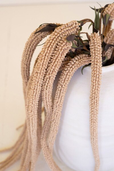 A neutral-toned grass stem with beautifully arched blades that evoke dried field grasses. Its earthy palette works effortlessly in fall and rustic compositions.