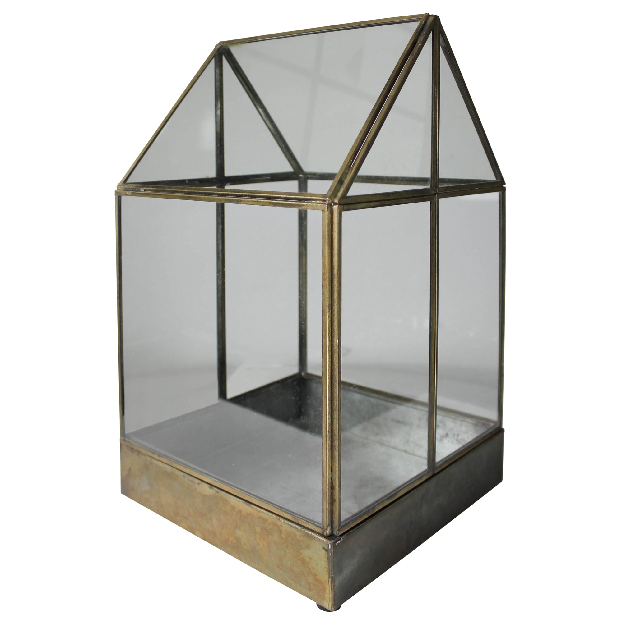 A simple leaded glass house with a gable roof that lifts off a galvanized base provides copious charm and endless opportunity to create a small-scale enclosed environment of plants, moss and rocks.