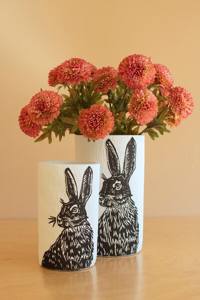 This pair of cement rabbit planters adds a playful springtime spirit to your home. Their textured forms and simple details create an inviting place for small plants or floral stems. Styled together or placed separately, they bring a touch of whimsy to any corner. Set includes 2 pieces. One each size.