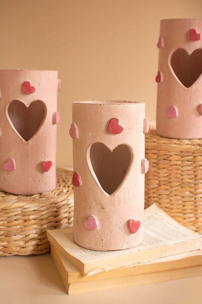 This Valentine luminary brings a warm, romantic glow to your home. Its carved heart openings cast soft patterns of light when a candle is placed inside, creating a cozy, heartfelt atmosphere that feels comforting and serene. The natural clay texture adds an earthy charm that works beautifully for quiet evenings, celebratory dinners, or simple everyday warmth. Whether styled alone or paired with flowers and seasonal accents, it adds a tender, inviting presence to any room. Handcrafted by skilled artisans in Honduras.