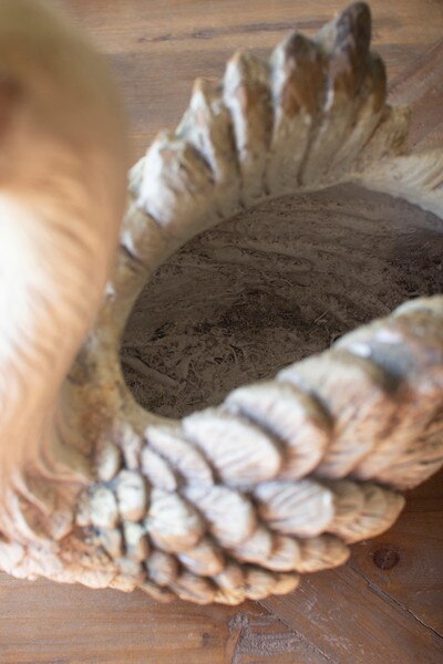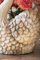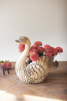 Graceful and serene, this swan planter brings a touch of quiet beauty to any room. Its sculpted feathers and gently curved neck create an elegant, timeless look, while the weathered finish adds soft character and charm. Fill it with greenery or simple stems to create a peaceful focal point on a table, shelf, or entryway. This swan offers a calm, nature inspired presence wherever it rests. Solid bottom. Finished all around. No drain hole
